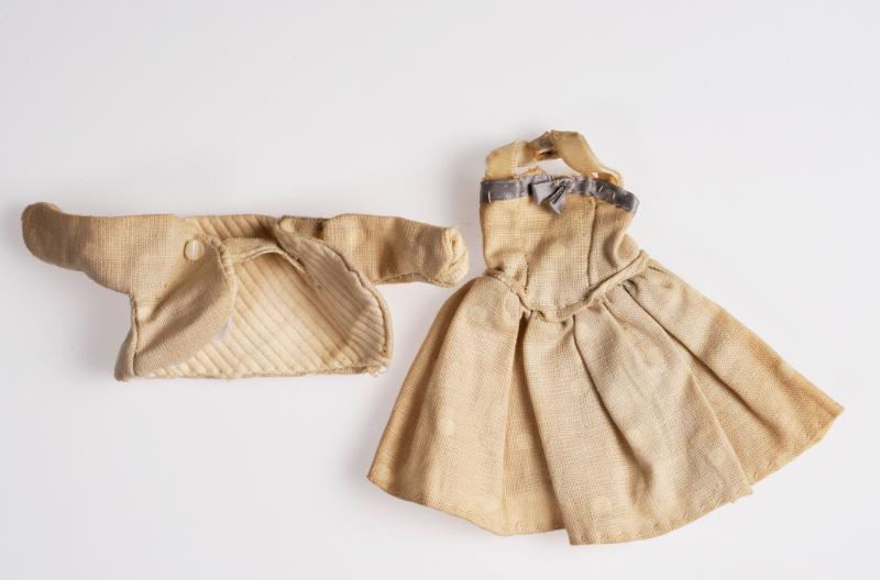 - Dockdräkt. Klänning: Ärmlös med vitt halterneckband. Ljusgrått linne med vita prickar. Blått rosettförsett band överst på livstycke. Tre krokar i ryggen, en tryckknapp på halterneckband. Jacka: Ljusgrått linne med vita prickar, vitt innerfoder, långa ärmar. Knäppning genom tryckknapp på vitt band som är synlig på framsidan. Två vita plastknappar på framsidan som dekoration.