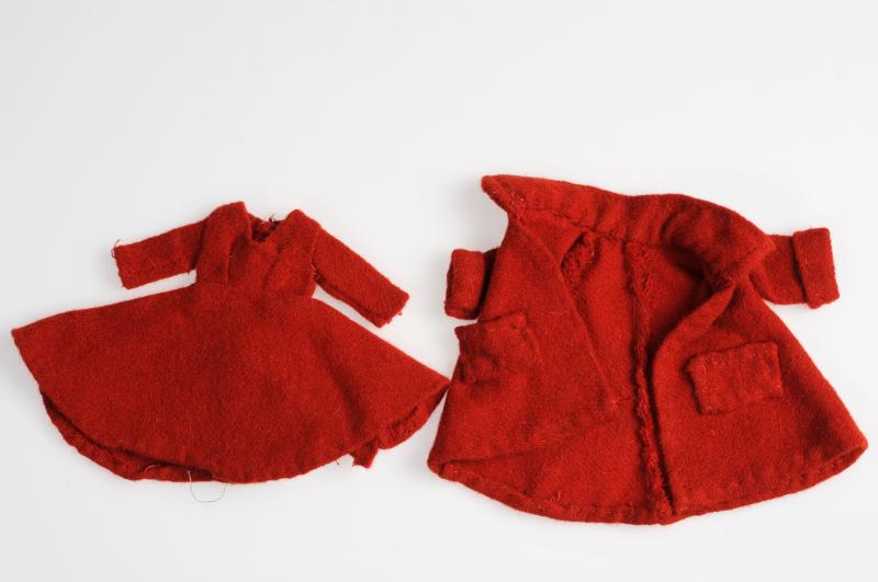 Röd, utsvägd kappa med två fickor framtill.[klänningen KM 93067]