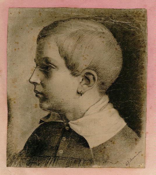 porträtt av pojke i profil, bröstbild, med ring i örat. Monterat på tunnt, ursprungligen rosa papper
