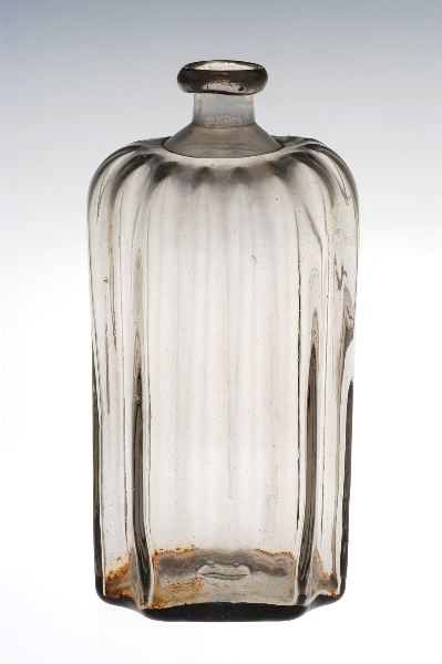 Svagt mangan. Rektangulär med konkavt avfasade hörn. Vertikala räfflor över hela flaskkroppen.