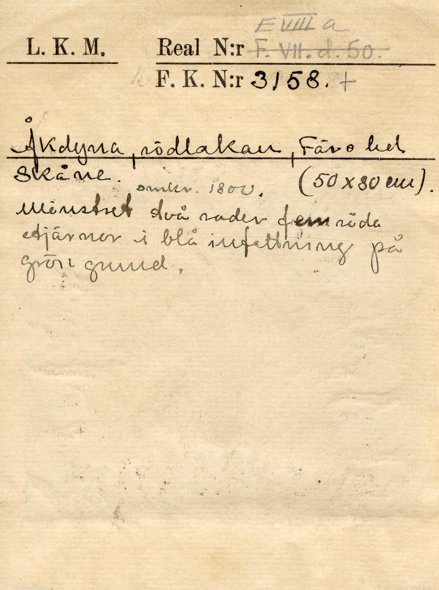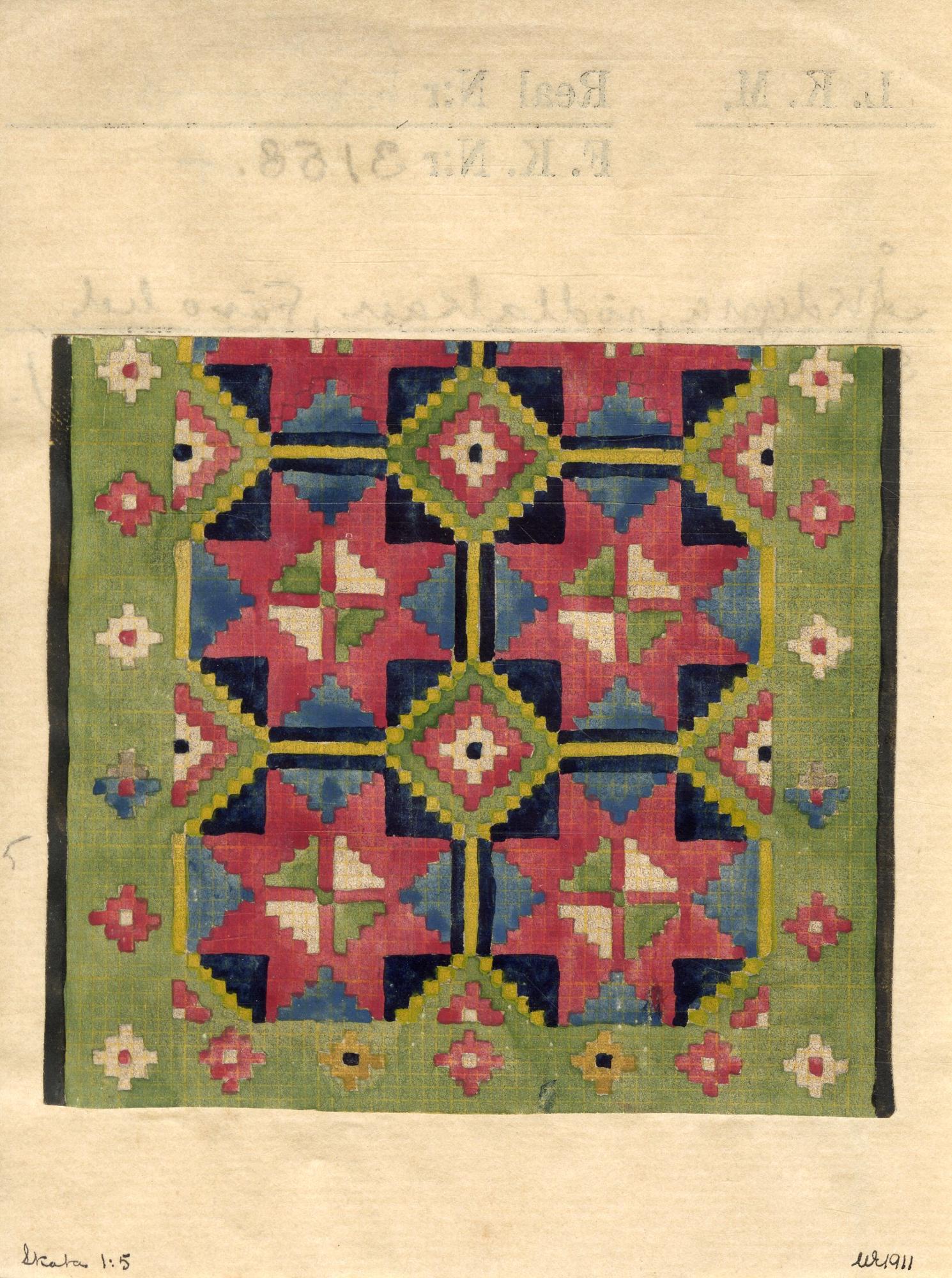 "Åkdyna 80x50 cm, från mellersta Skåne. Ytmönster: gallerverk med diagonalrutor, åttkantiga bottnar med stjärnor inskrivna i raka kors och mittrosetter." Karin Blomqvist, Kulturens årsbok 1989, bildtext till färgbild IX.