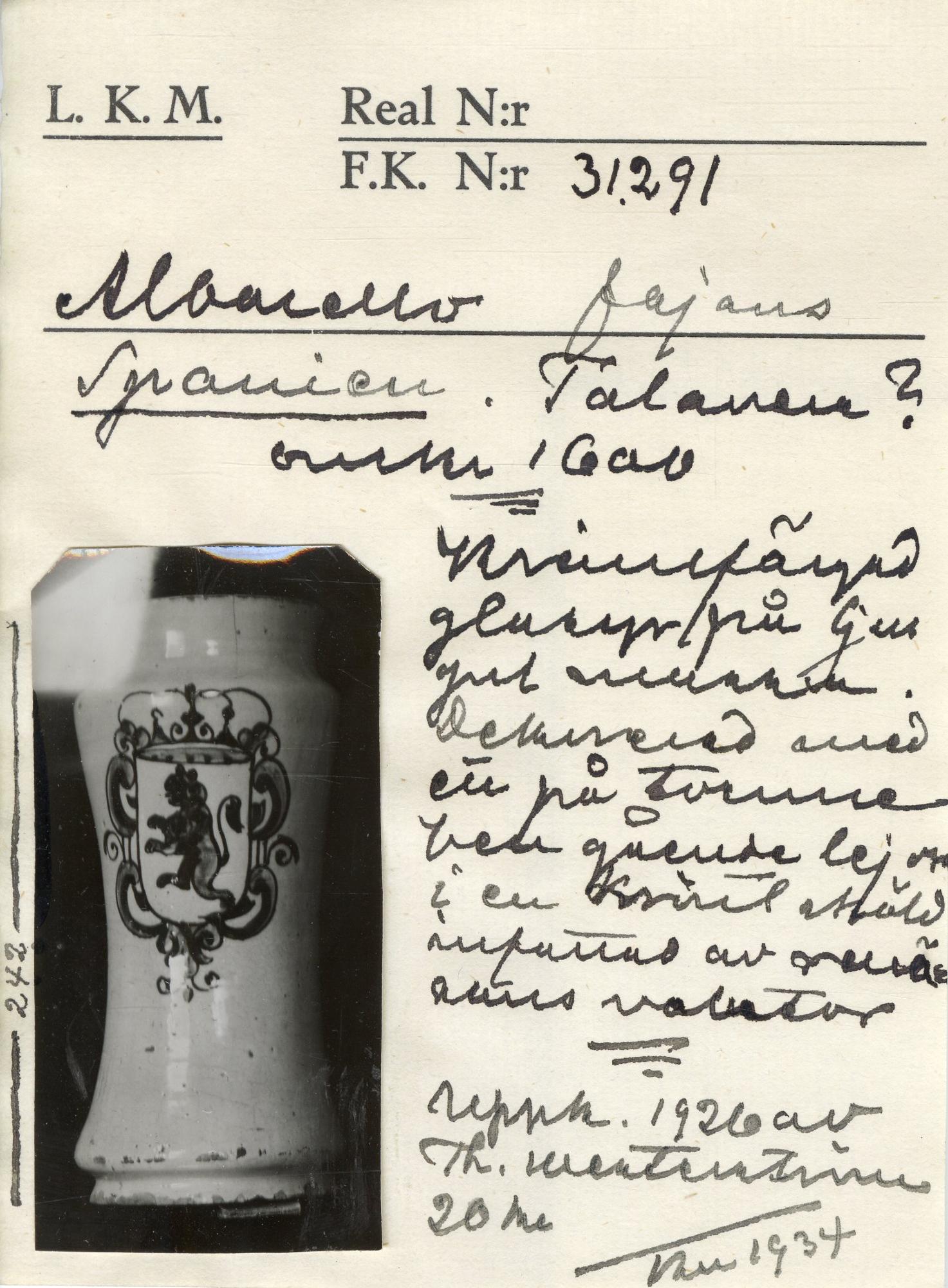 Frotthingham Wilson Alice, Talavera Pottery, New York 1934, s. 119, fig 110; Kulturens årsbok 1950, Kjellberg Sven T, Spansk keramik, Från en sommarresa, s. 38-83, bild 27 s. 69.