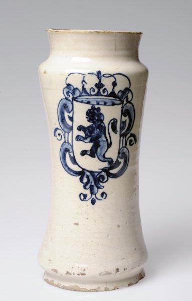 Avsmalnade och åter vidgande uppåt. Krönt vapensköld med ett lejon. Krämfärgad tennglasyr. Dekor i blått.