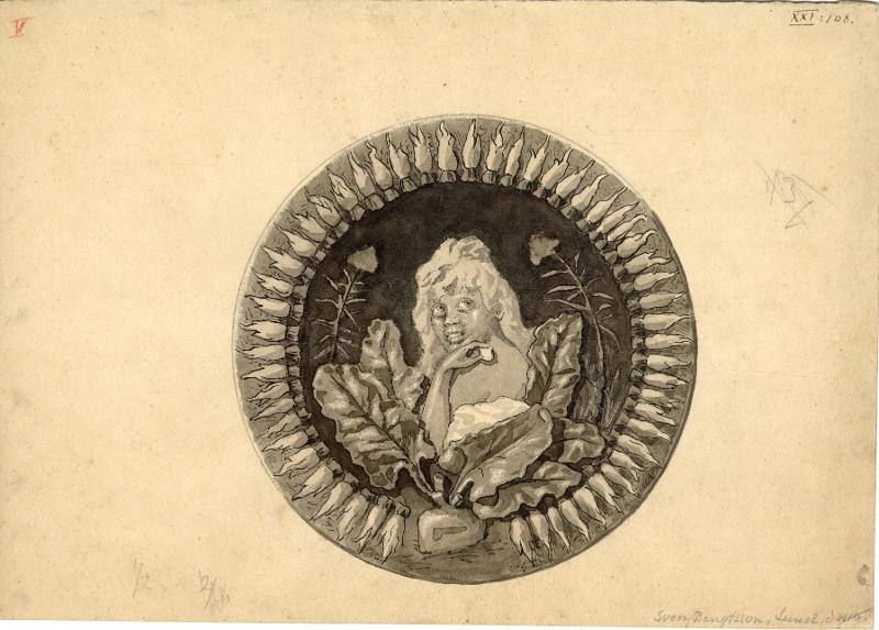 Kulturens arkiv 21.108 Teckning laverat tusch-, prydnadsfat i glaserat lergods med i botten en kvinnobyst över frodiga kålblad och tistlar, osignerad, komponerad och utförd av ciselören Sven Bengtsson i Lund, d. 1916. Fatet ingår i Kulturens samlingar. Konstslöjdsanstaltens arkiv och Sydsvenska konstindustrilotteriets arkiv.