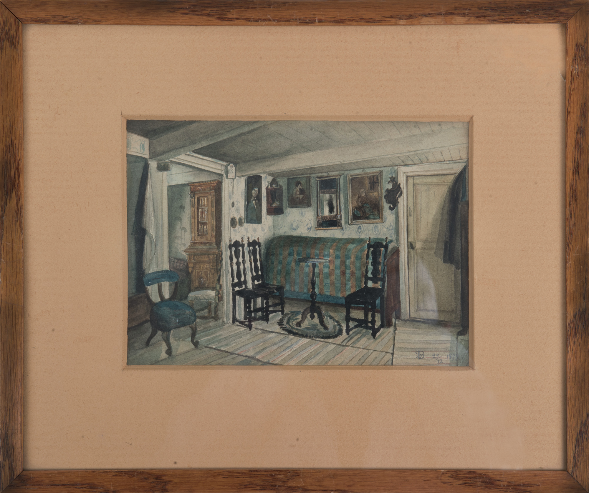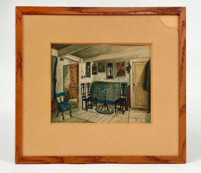 Interiör med stolar och bord, trasmattor, hopfällda sängtavlor på väggen mm. Från ciselören Sven Bengtssons barndomshem i Svanegatan, Lund.