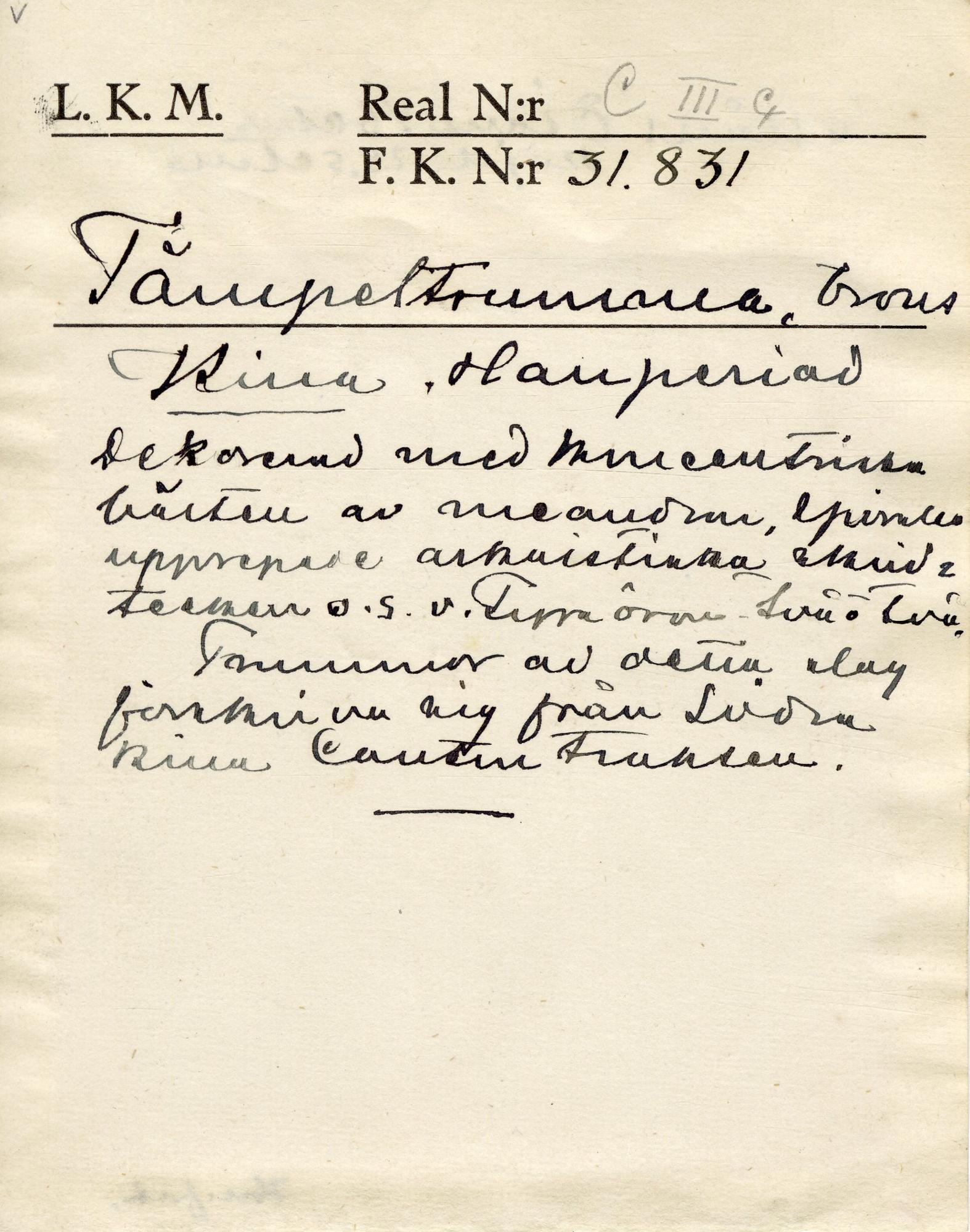 - Bikonkav, indragen i midjan, överdel utgörs av en flat skiva. Fyra hållare intill varandra, två på vardera motstående sida av kärlet. Ornering på kärl och skiva; koncentriska cirklar, bälten av meandermönster, spiraler, skrivtecken, geometriska figurer och punkter.