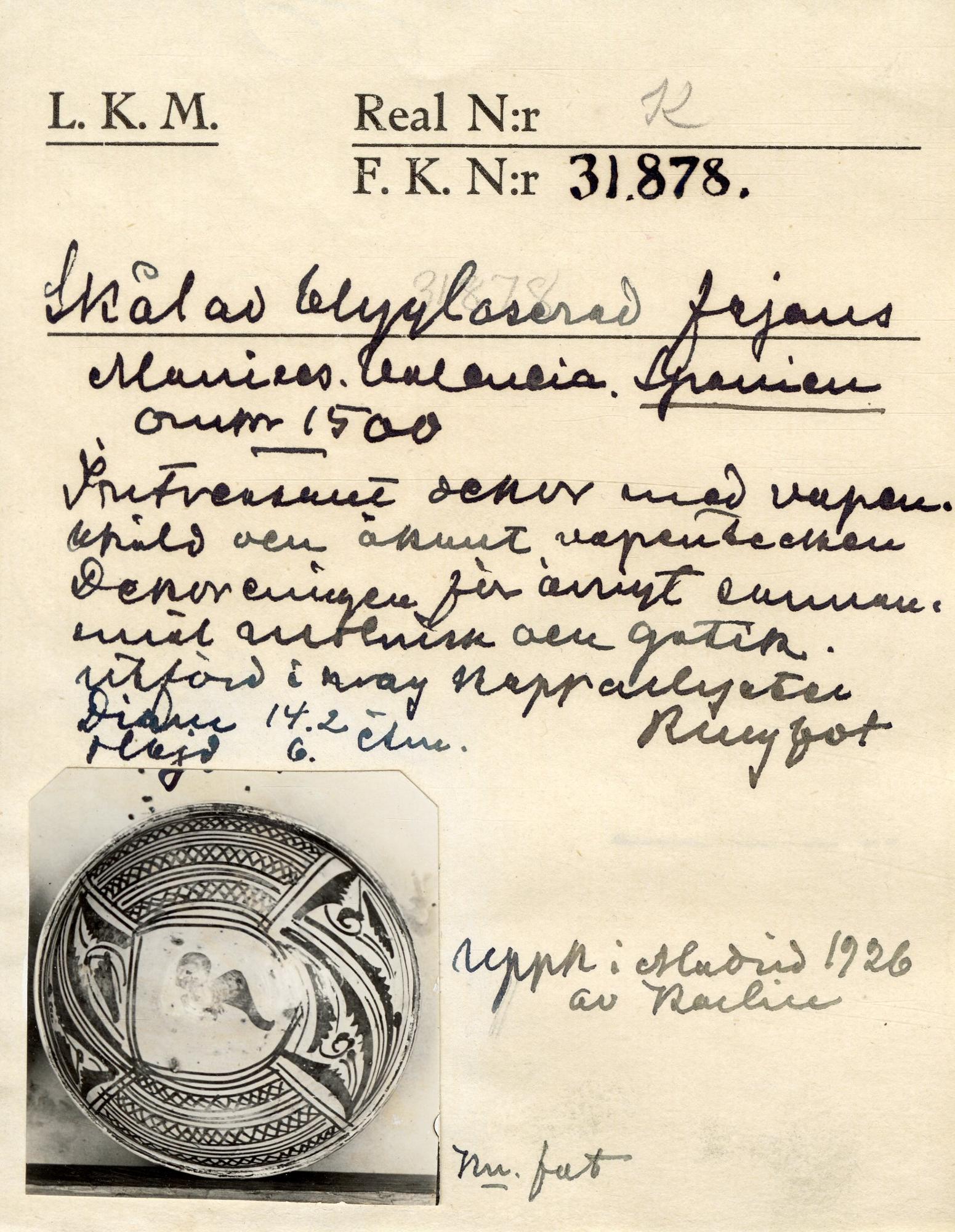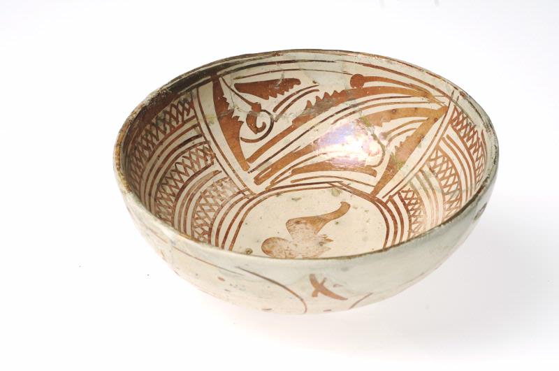 Abstrakt ornamentik. undersidan enkelt dekorerad. Krämfärgad glasyr. Dekor i kopparröd lyster.