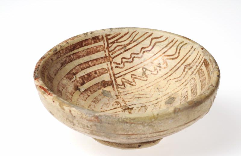 Streck och vågmönster, undersidan enklare. Krämfärgad glasyr. Dekor i kopparröd lyster.