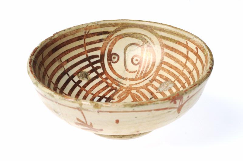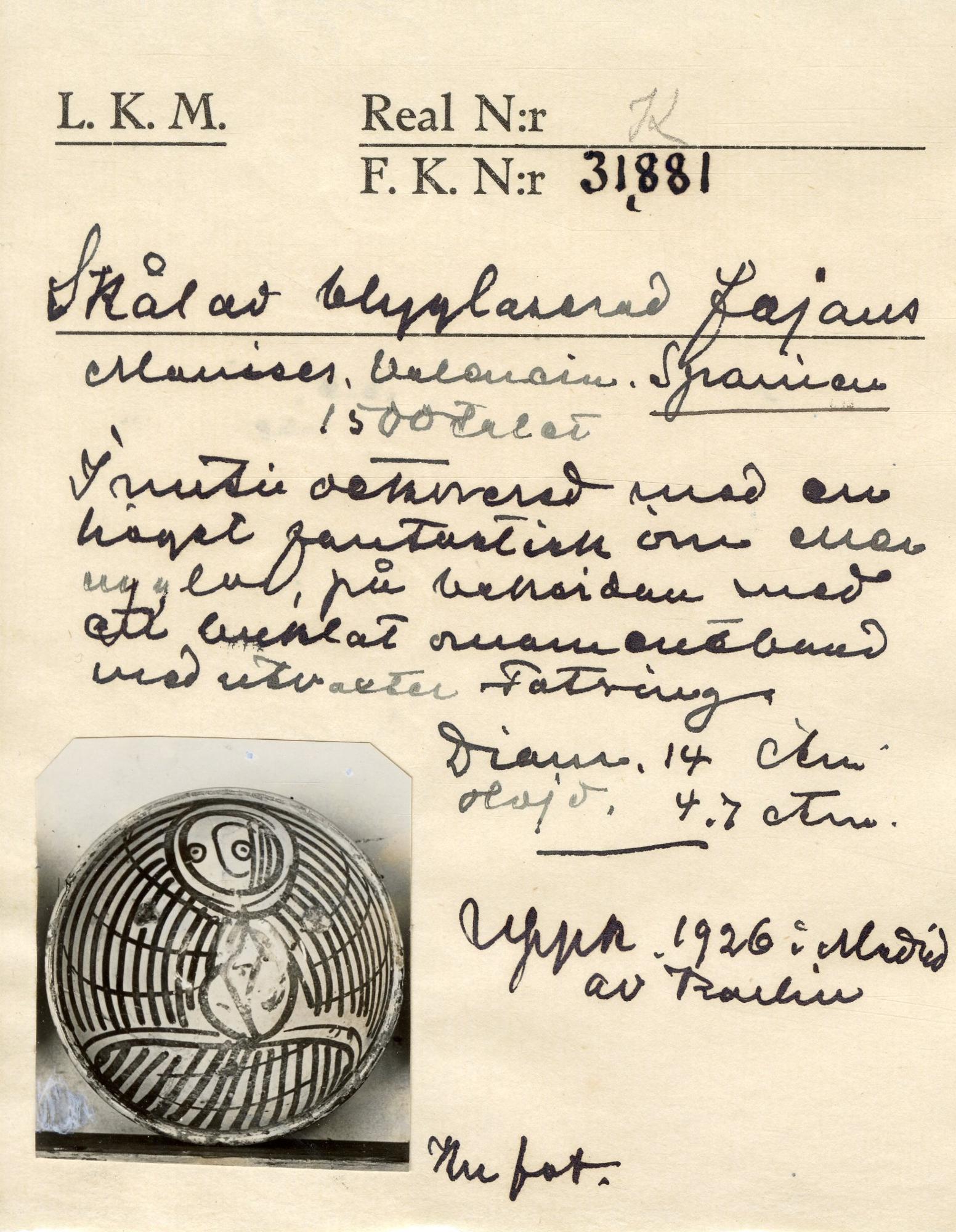 "... med lystrad dekor har man helt frigjort sig från det moriska inflytandet. De heraldiska motiven med örnar, såsom här, blir allt vanligare mot medeltidens slut. ... Manises, 1500-talet."