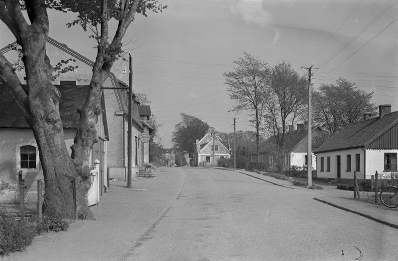 affär; bebyggelse; hus; landskap; blomma; buske; cykel; elstolpe; gatsten; grind; himmel; pump; skylt; staket; tidning; trafikskylt; träd; trädgård; villa; växt