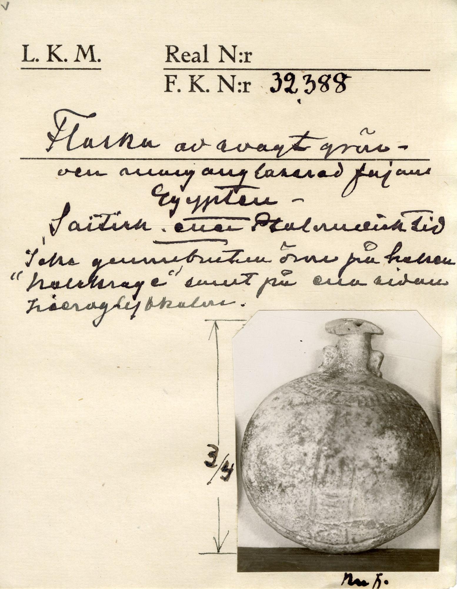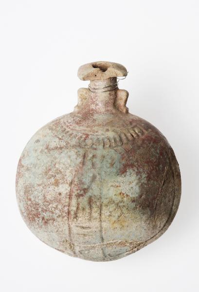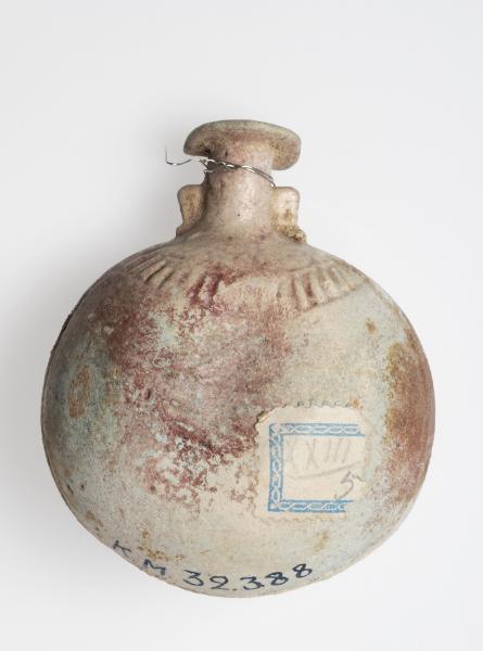 Rund med "Da" och hieroglyfer. Svagt grön- och mangan glaserad. Öronen är inte genombrutna. Halskrage.