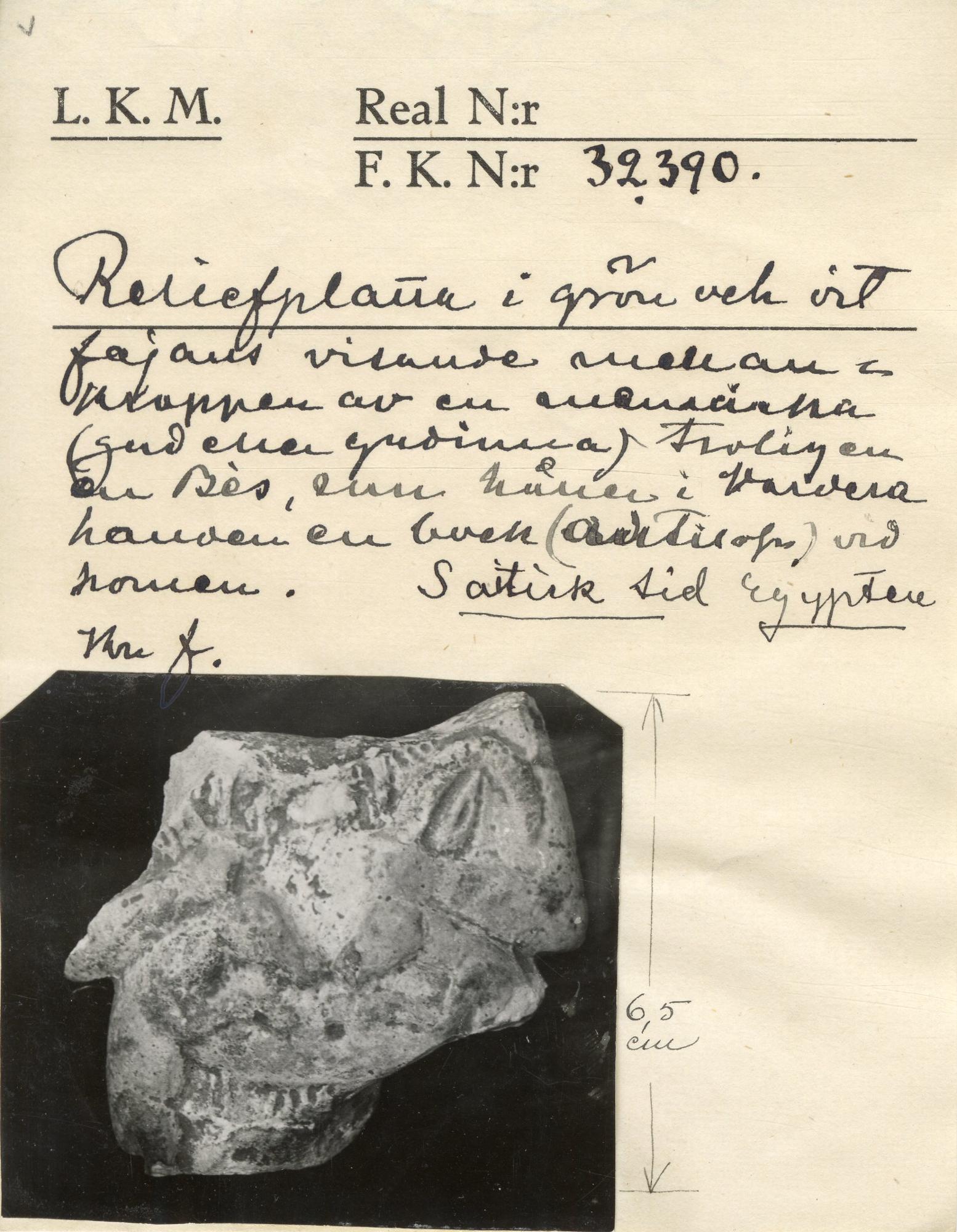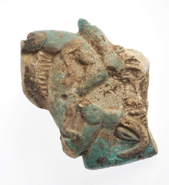 Kopia. Återger mellankroppen av en människa, gud eller gudinna, troligen en Bés, som håller i vardera handen en bocik, antilop, vid hornen