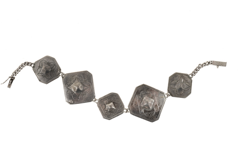 Består av fem kvadratiska tröjknappar med avfasade hörn, som länkats samman och förlängts med kedja för att användas som armband. Okänt när omarbetningen gjorts. Knapparna omväxlande i två storlekar, mindre ca 2x21 cm (3 st.) och större ca 3x3 cm (2 st.). Länken pansarkedja, säkerhetslås med rutmönster påminnande om murat förband.
