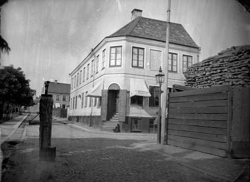 Lund. Hus vid Bantorgets ö sida. 1890-talet. Platsen för Grand Hotell. Vem kikar fram bakom lyktstolpen?