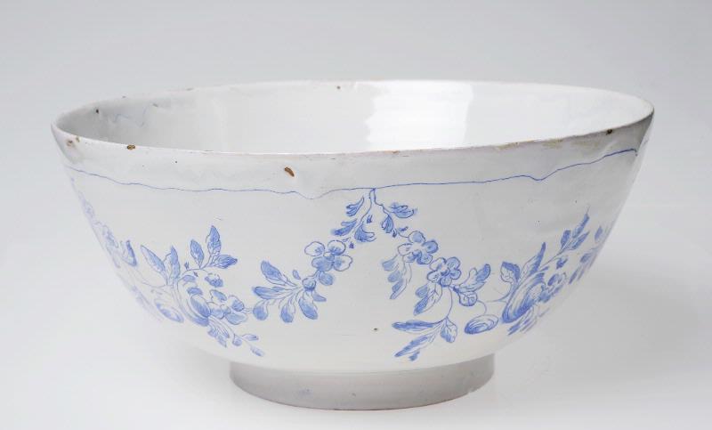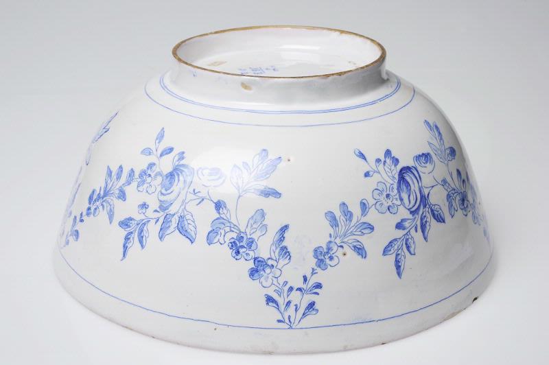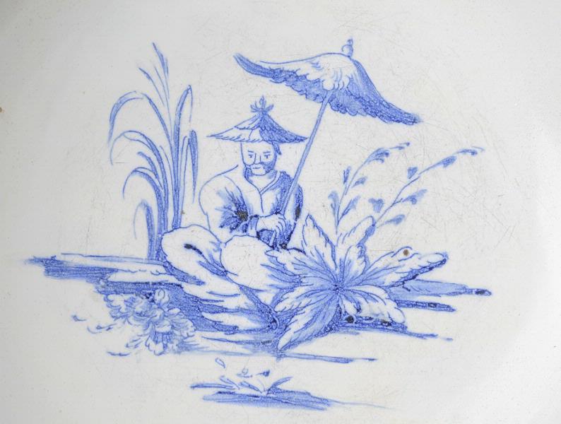 Rund, djup med svängd sida och vid mynning. Blå starkeldsdekor På insidan målat sittande kines under parasoll, på utsidan blomsterranka.