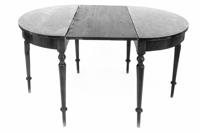 Tvådelat. Två fristående delar som kan användas som halvbord. Sex svarvade ben. Sekundär mellanskiva [tillverkad på Kulturen].