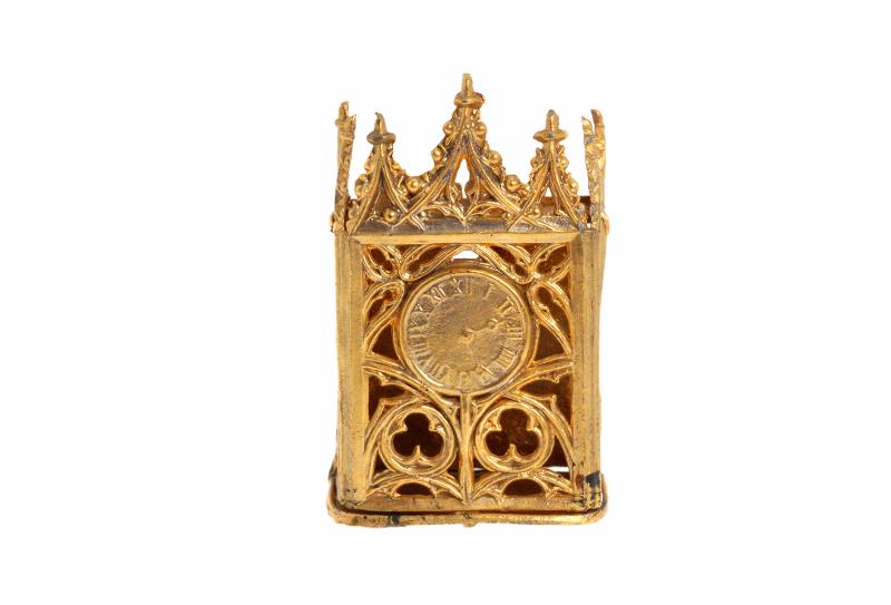 1 st bordsur, nygotik, genombruten metall, guldfärgat, H 3,5 cm B 2,3 cm Dj 1,3 cm. Vårdåtgärder: rengjord m. pensel.