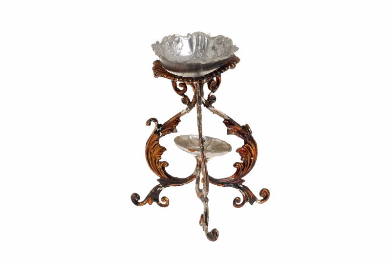 Brunmålat tvättställ i gjuten metall (bly?), kanna och fat av tenn saknas vid Sesaminv. 1998, skador: skevt, H 7 cm, Br 6 cm.