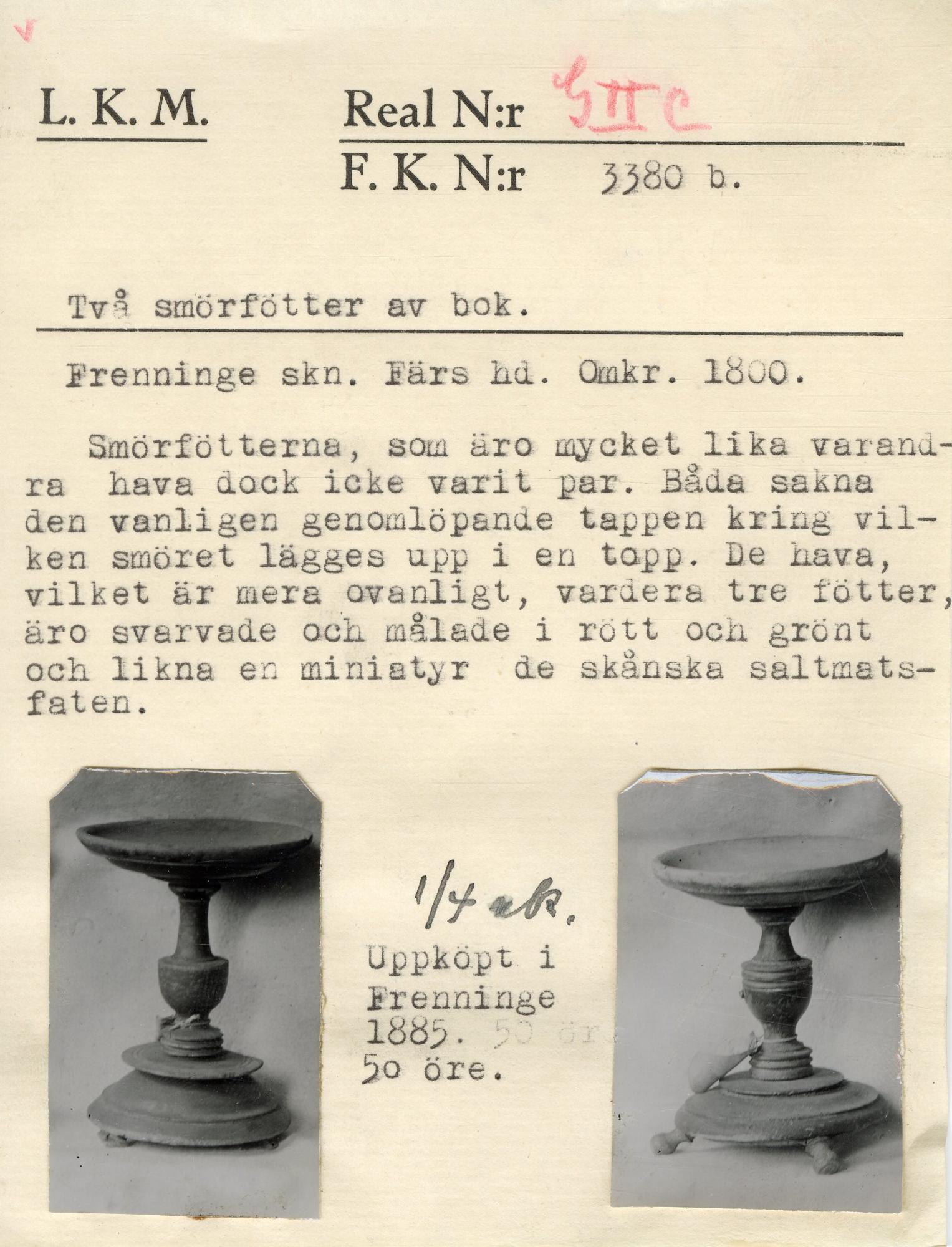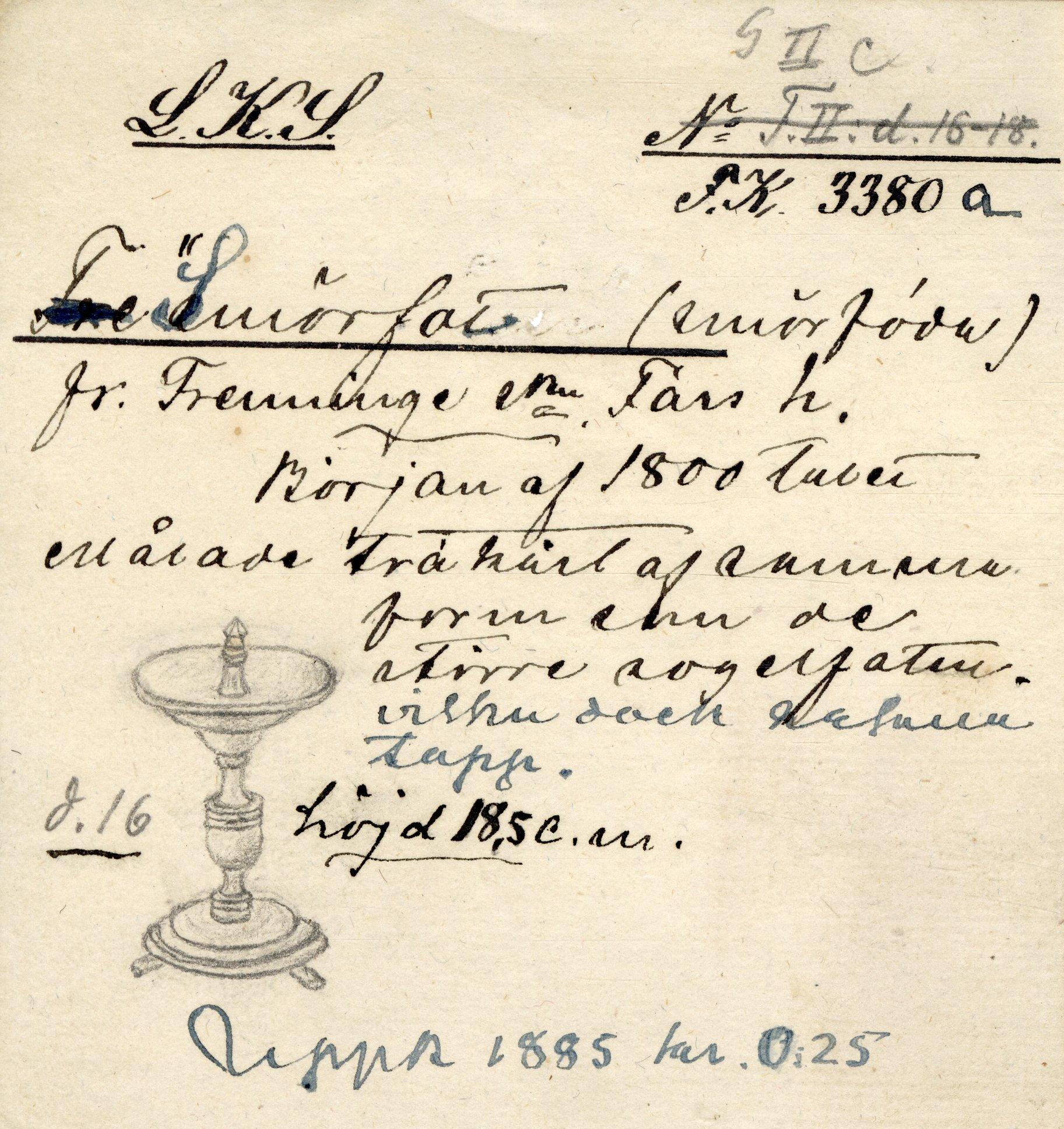 Nederdel som en upp och ner vänd skål med rödkant. Fötterna indragna under nederdelen. Mellandelen med många svarvade detaljer. Ovandelen med röd kant.; Nederdel med utstående nästan liggande fötter. Mellandel med många svarvade detaljer. Mest svart med röda detaljer.