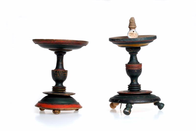 - Nederdel med utstående nästan liggande fötter. Mellandel med många svarvade detaljer. Mest svart med röda detaljer.
