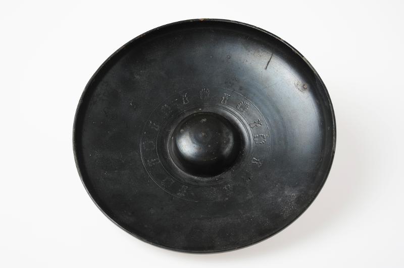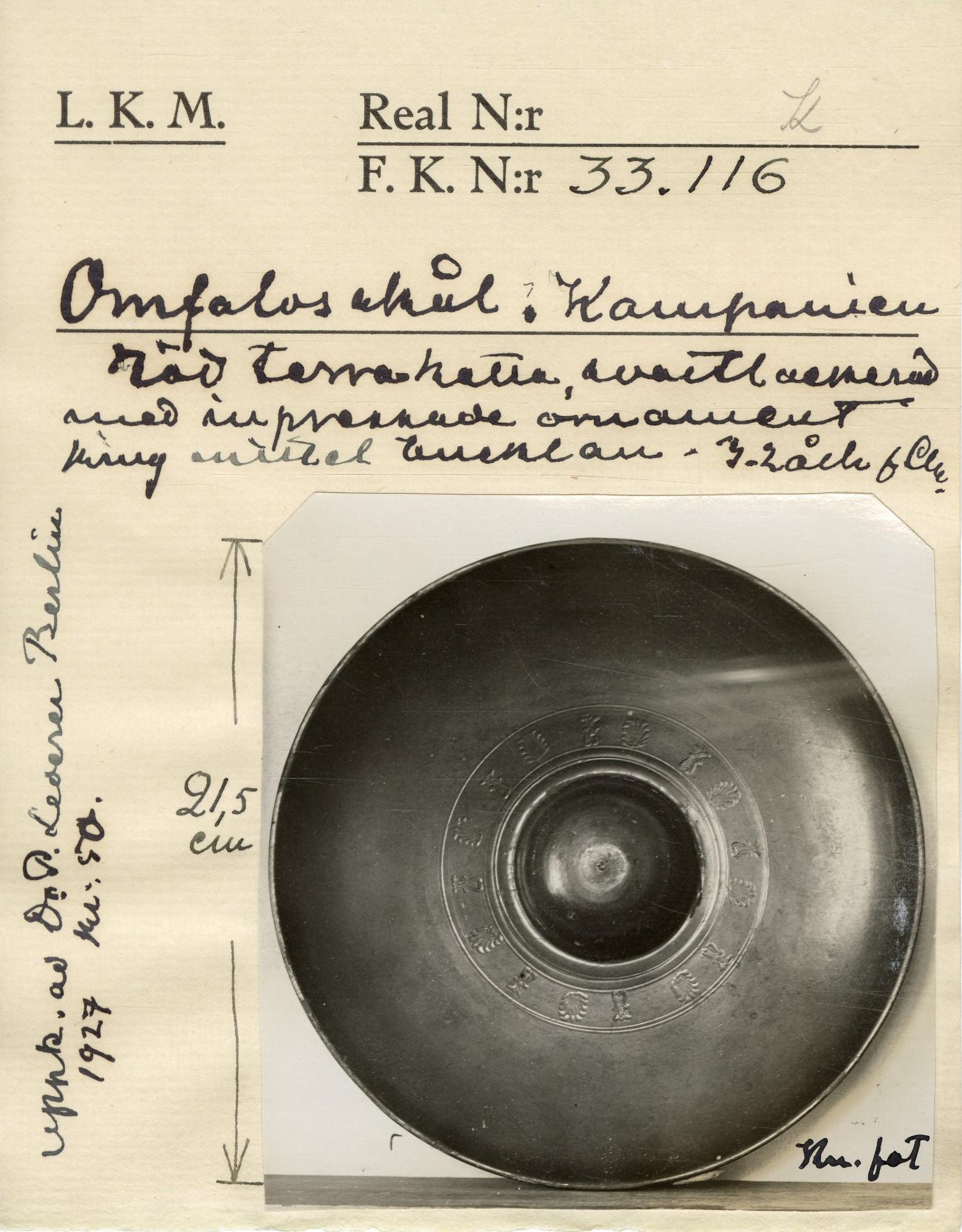 "Det råde ingen tvekan om vad grekerna kallade en sådan skål, eftersom deras benämning beskriver formen så väl, phiale mes-omphalos, vilket betyder "skål med navel i mitten", eller bara phiale, skål. Av romarna kallades den helt enkelt patera, skål...Vid dryckeslag, symposier, kunde vinet serveras i phiale och vid dryckesoffer, libationer, var det regel att använda en sådan...Kulturens offerskål, som är mycket välbevarad, är troligen av etruskisk tillverkning och från samma tid som etruskern med offerskålen i handen, d.v.s. 200-talet f.Kr."