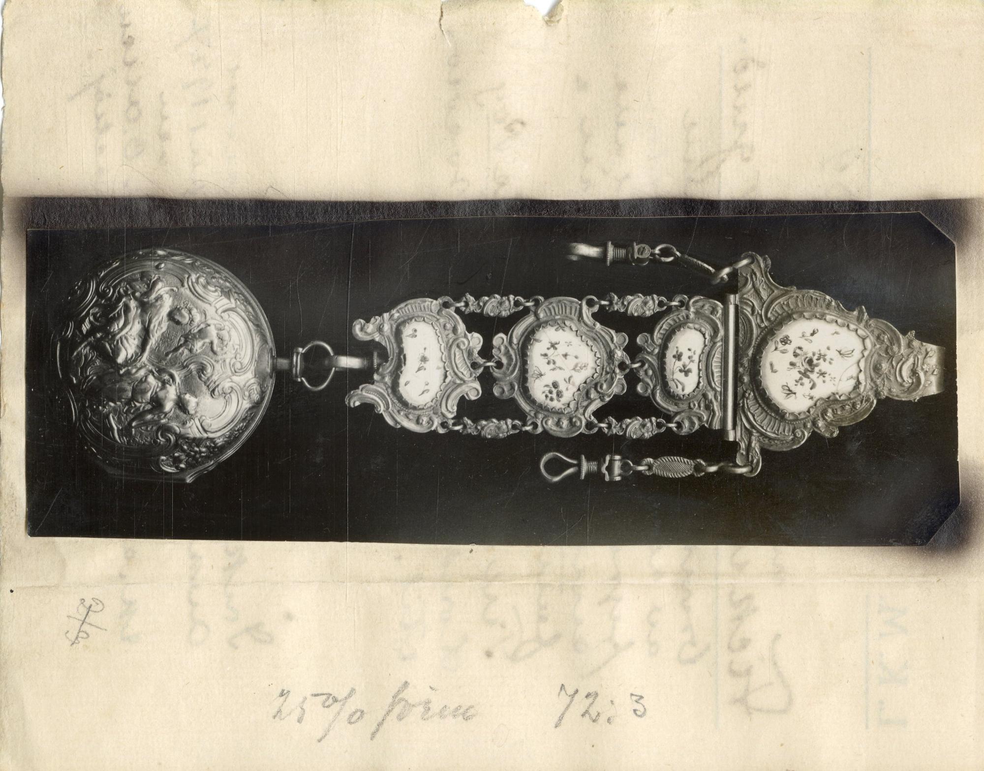 Kedja av förgylld brons med driven och ciselerad dekor och infällda vitglaserade porslinsplattor med polykrom blomstermålning, Överst en hake att hänga över fickkanten så att uret hängde fritt ned från västfickan. 1700-talssnobben hade ofta ett sådant i vardera västficka.