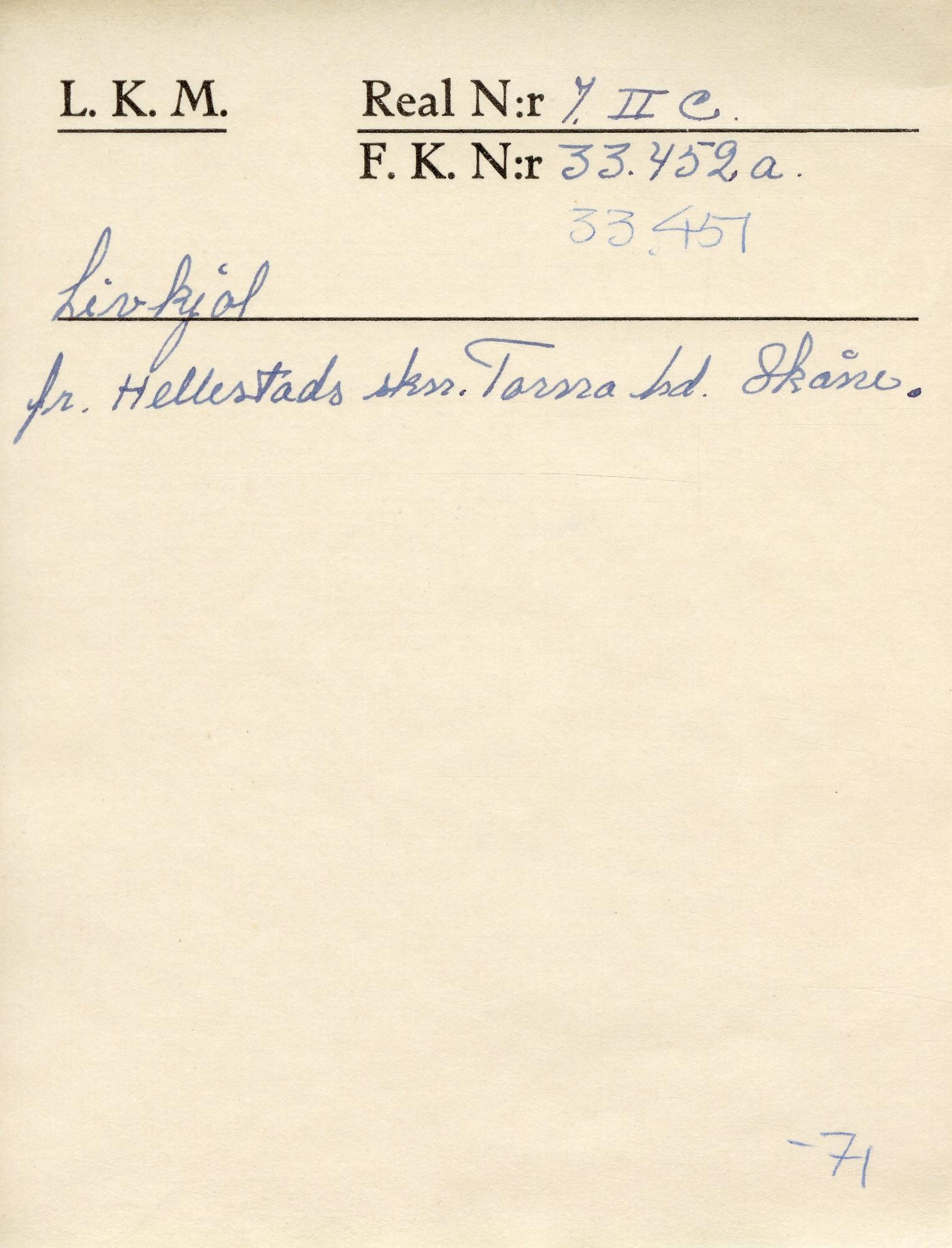 Kjolen i mörkblå vadmal, 4 våder. Framvåderna 46 cm vardera, sidovåderna 41 cm, bakvåderna 71 cm. Sprund fram 25 cm. Insydd ficka på ena sidan. Livet av blommigt broscherat siden, grön botten med blommor i rosa och varmrött, blad igulgrönt. 5 cm breda kanter av grönt siden. Foder i blått linne. Kjolen nertill prydd med 3 rader släta och blommiga sammetsband. Ficka av grått bomullstyg. Sprund och nederkant skott med samma tyg. [Avbildad i skala 1:10 på katalogkort]