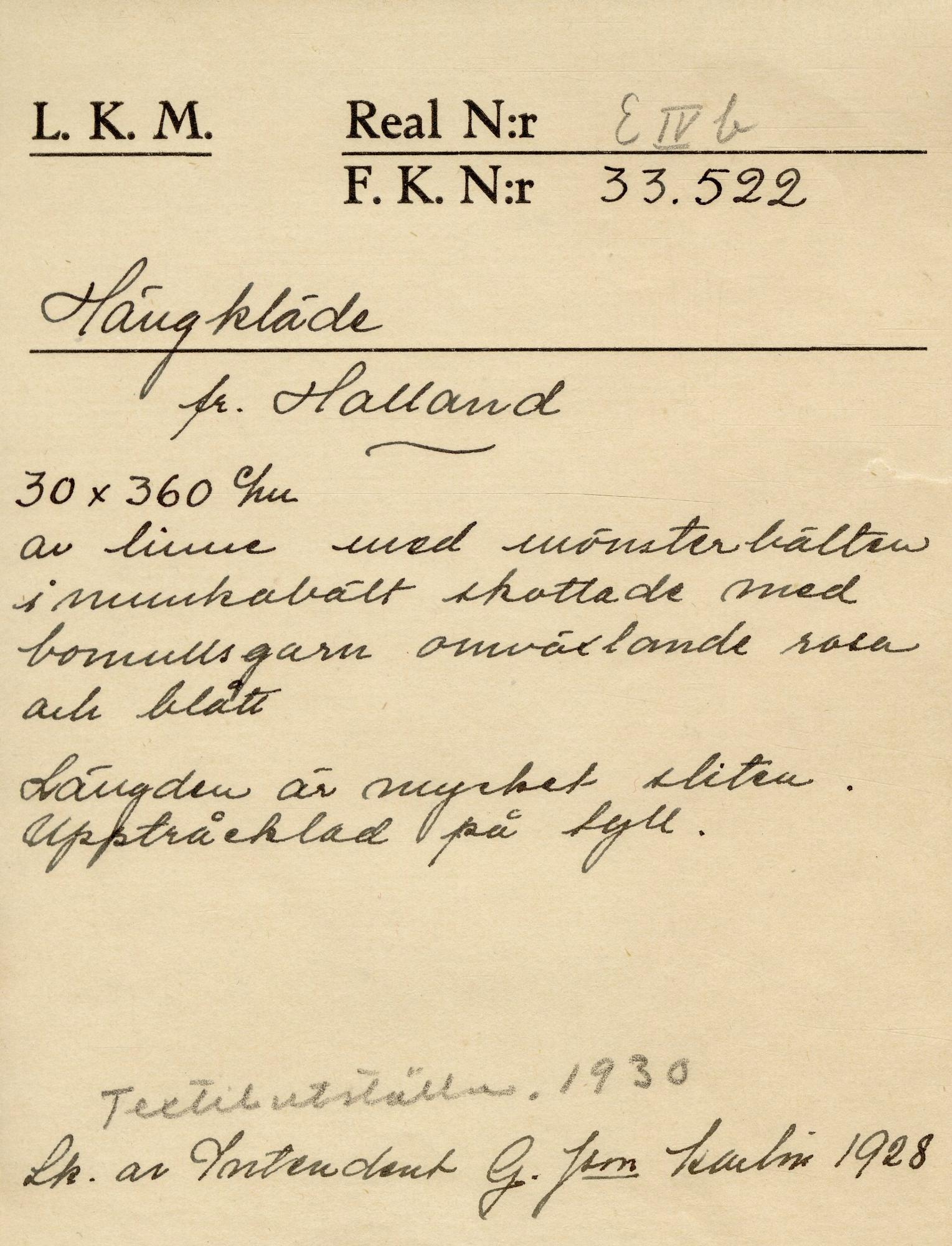 Vit botten. 7 breda invävda bårdpartier i rött och blått. Mellan dem smalare bårder.