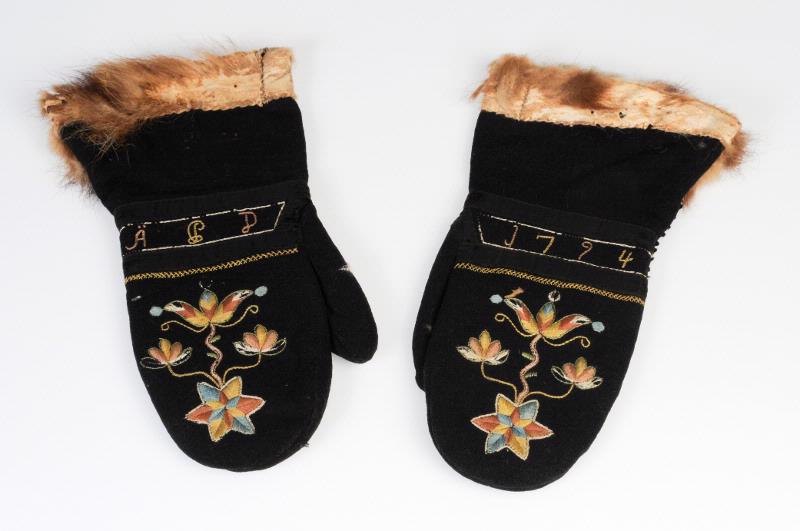 - Svart ylletuskaft, helt pälsfordrade och med pälskant. På ovansidan silkebroderi i plattsöm och kedjestygn med stjärna och blommor i blått, gult, rött (nu blekt till rosa). På handledens ovansida initialer i kedjestygn, ÄPD, i gult och rött (rosa) omgivet av vit ram och inramat med svart silkesripsband. Samma inramning kring årtalet 1794 (i samma teknik och färger) på vänster handleds ovansida.