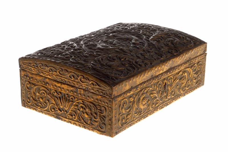 Skrin av driven och ciselerad messing 1600talet. Okänd proveniens. Stommen av trä, på alla sidor (utom botten) belagd med drivna messingsplåtar. Barock ornamentik på locket inneslutande ett adligt icke svenskt introducerat vapen. Mått: 29x21x10. Uppk på auktion på Osbyholm [oläsligt] juli 1928 kr. 60 [foto på katalogkort]