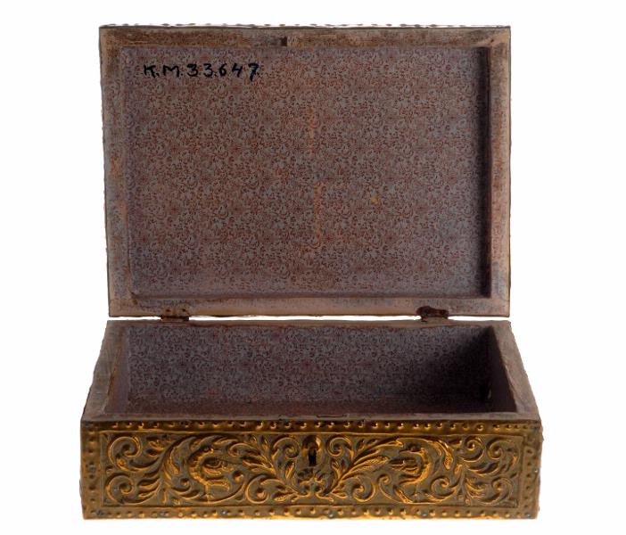 Rektangulärt. På lock och sidor helt klädd med mässingsbleck med dekor i drivet och ciselerat arbete med bladrankor och på locket ett utländskt adligt vapen samt i de främre hörnen fåglar och i de bortre en sexuddig rosett. Blecket är vikt över sidor och hörn och fastgjort med små järnstift. Locket går på två gångleder av järn. På framsidans insida ett infällt lås med nyckelhål. Under bottnen pappersklädsel, inuti helt klädd med ljust gråblått papper med bladslingor och rosetter i brunt. [Sannolikt använd till förvaring av smycken och mindre dräktspersedlar eller liknande].