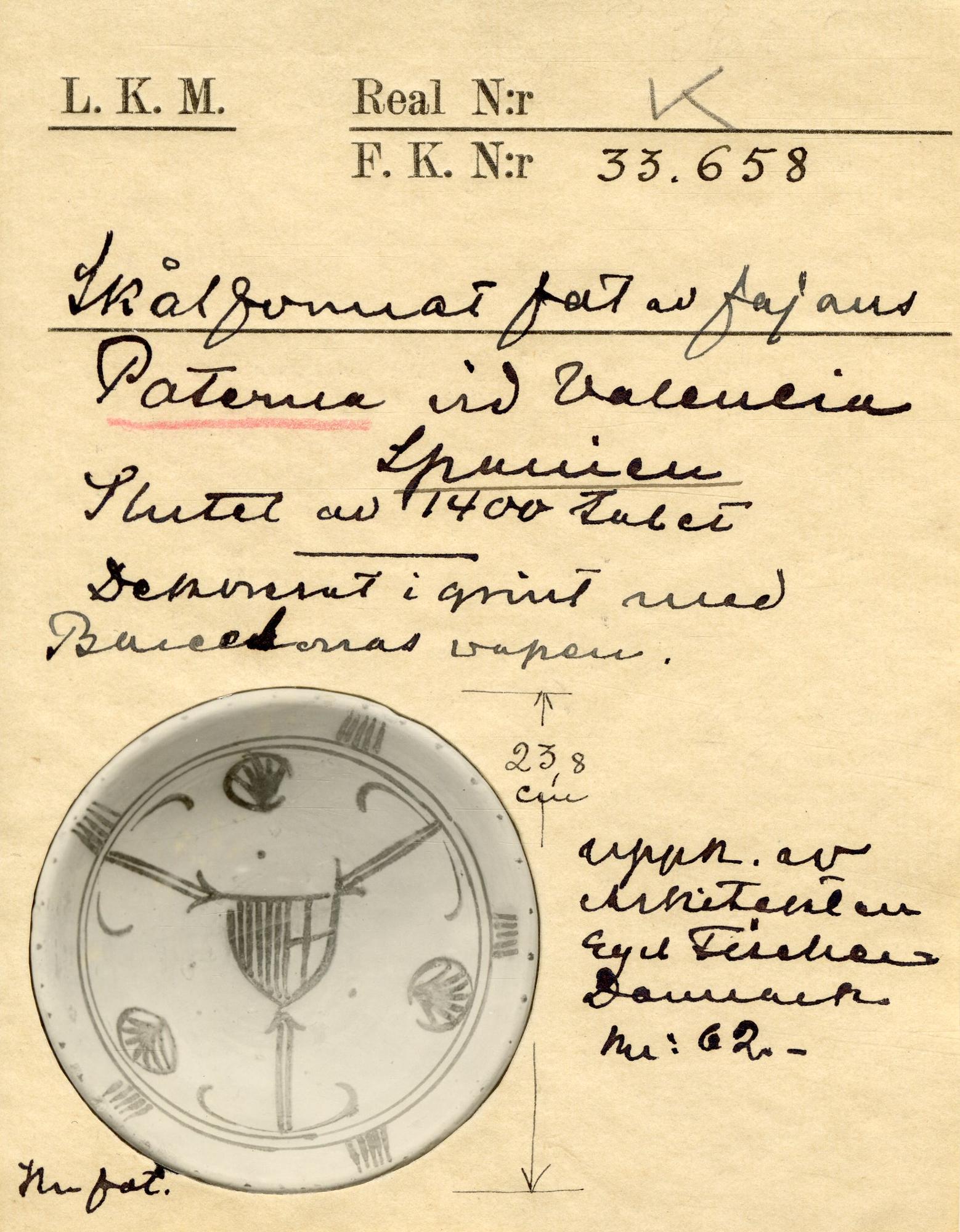 "Skålfat i fajans, dekorerat i grönt med Barceonas vapen....Paterna, 1400-talet."