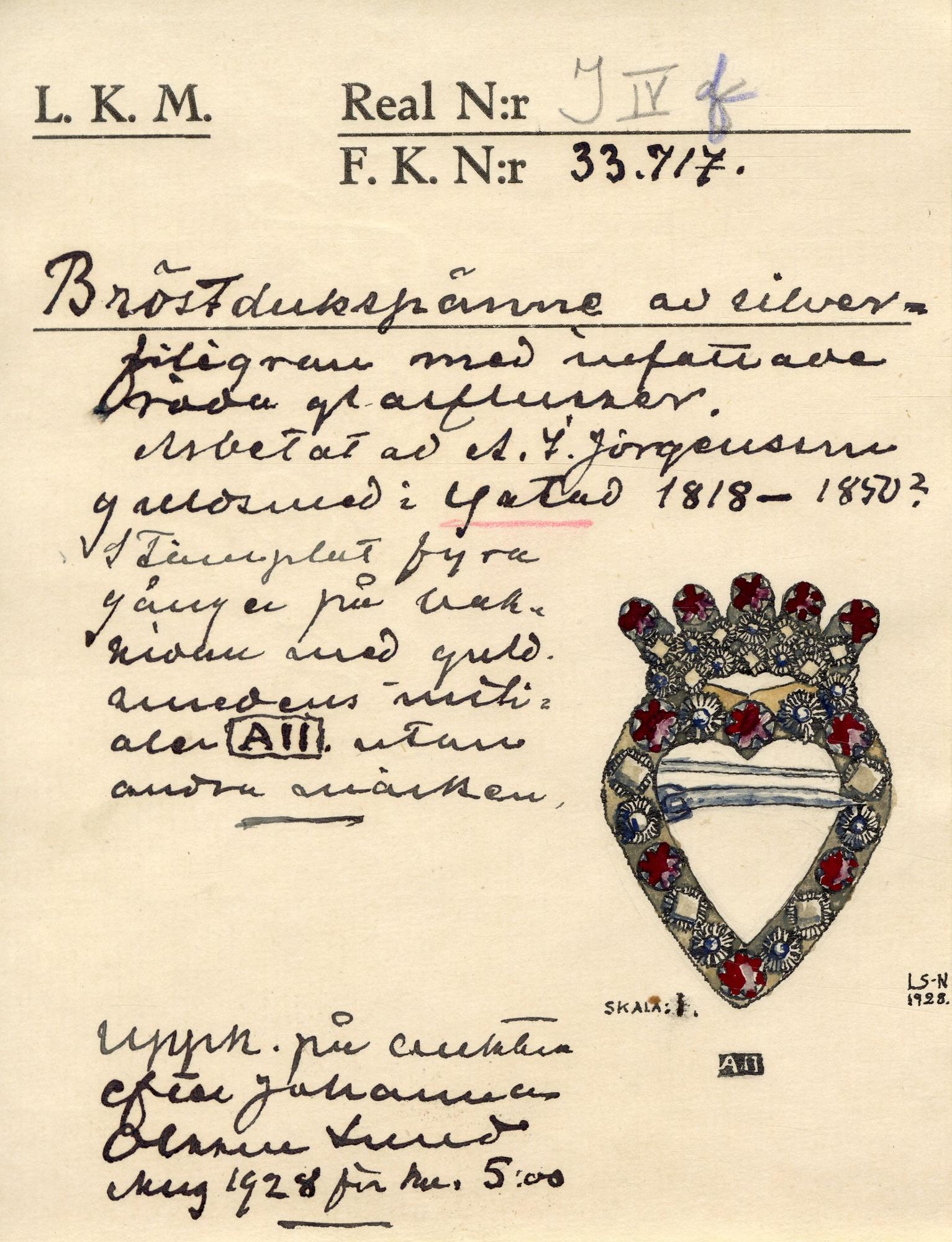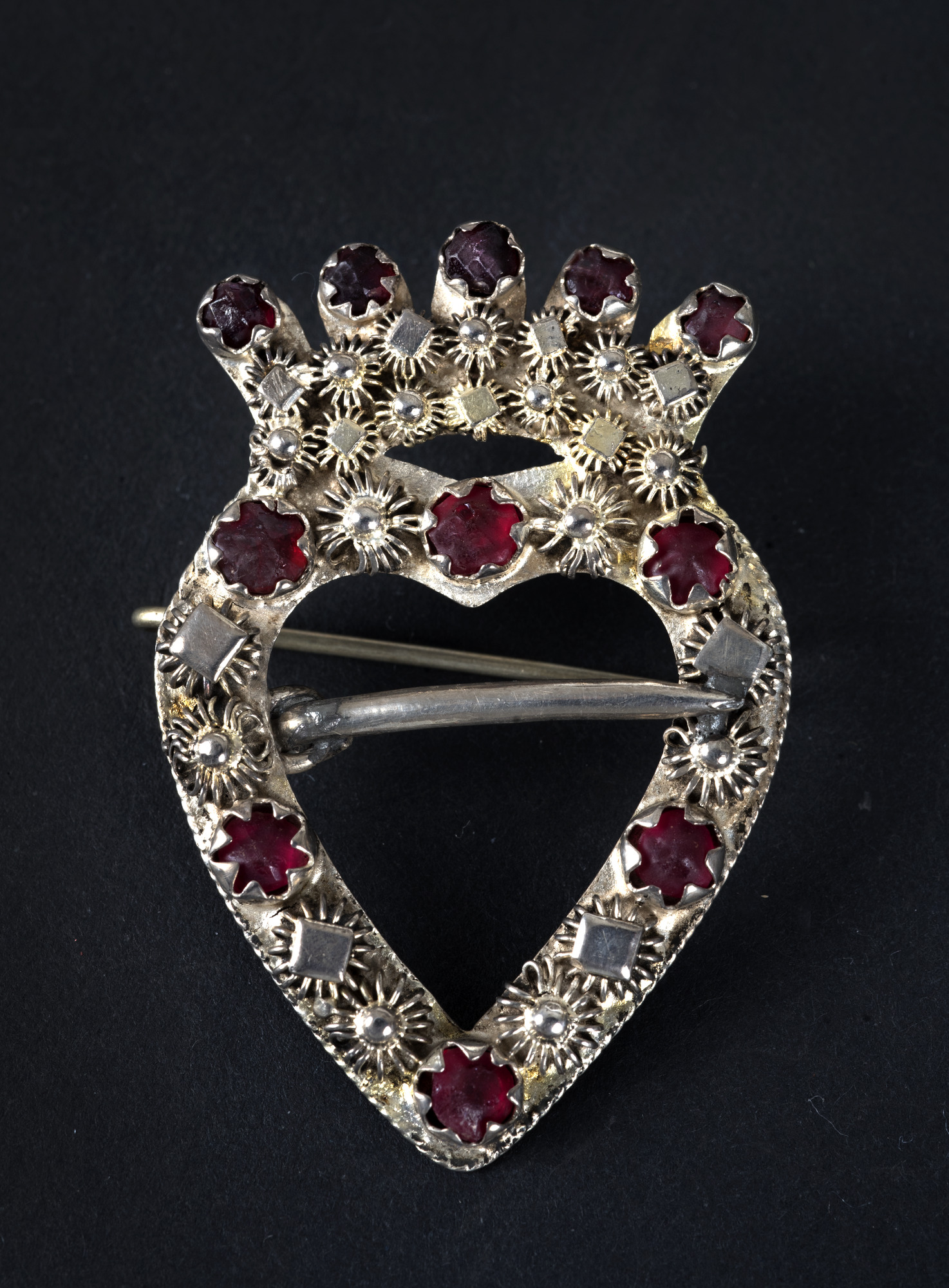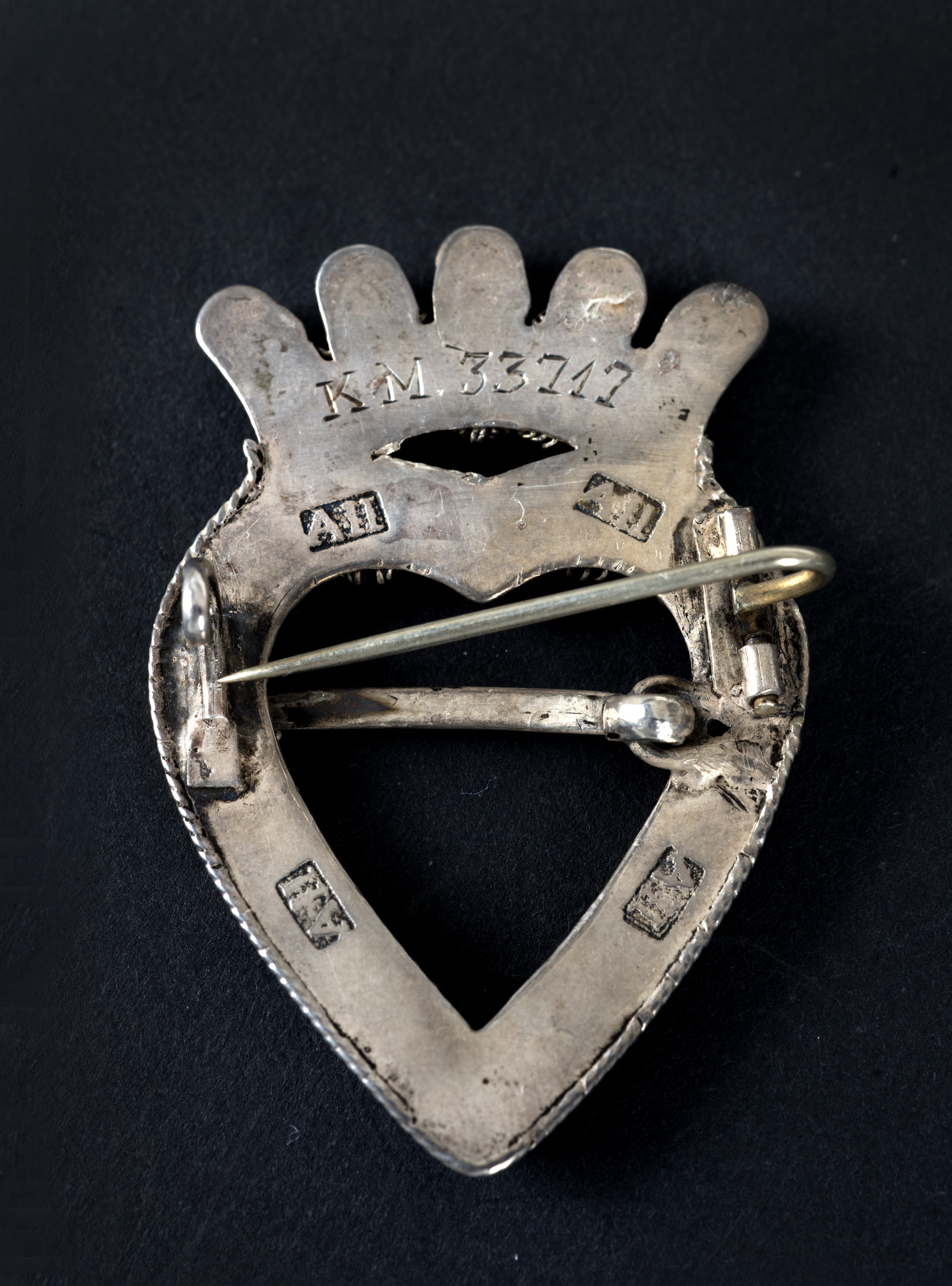 - Hjärtformigt, krönt med krona med fem strålar. Dekorerat med filigran med små kvadratiska plattor och kulor. På framsidan spår av förgyllning och infattade röda glasflusser. På baksidan en sekundärt påsatt nål med ögla.
