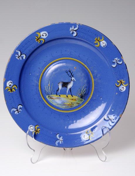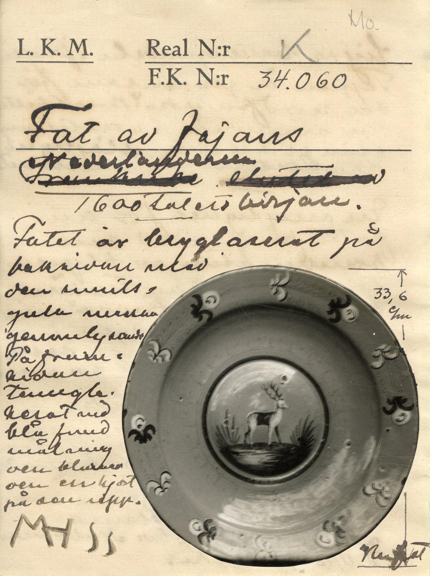 "Medaljongens djurbild är tecknad i den persisk-italienska stil vi finner på de tidignederländska flisorna från Antwerpen och djur- och figurmotiv. Brättedekoren är en variant på en ranka, som holländarna hämtat från Faenzas 'compendiaro-fat', bild 4 och årsboken 1974 sid 132. Också den blå fonden är ett arv från Norditalien, där den ju förekommer vid vissa verkstäder."