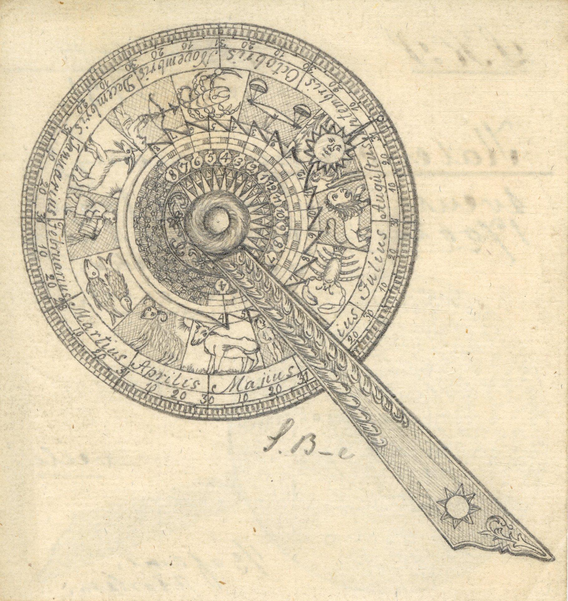 - Cirkelrund mässingsskiva med 110 mm:s diameter. På skivans framsida inom cirklar ingraverat från kanten mot centrum månadernas dagar, den 10:nde, 20:nde, 30:nde och 31:ste angivna med siffror. Månadernas namn. Djurkretsens symbolfigurer. På baksidan ytterst ett band med bladornament samt ett textfält med texten: Ett åhr Inne Håller 365 Dagar 5 timar 49 minuter. Hela åhret I Timar 8765 och 49 minuter. Dito uti Minuter Hela åhret 525949. Dito i secunder 31556940. Där innanför ett textband med 1/4 genombrutet, med texten: Wij Lychta Wår åhr Såsom ett Tahl. I centrum ett fält med månskäran, stjärnor och inom ett textfält veckodagarnas namn. Detta textfält mitt för och intill det genombrutna bandsegmentet. På framsidan av skivan rörligt fästad en tandad cirkelskiva och geometrisk ornamentering. På en av tänderna en solskiva omgiven av strålar som visare. Dessutom är även rörligt flätad på denna sida en ornamenterad visare. I det genombrutna fältet på baksidan är siffror inristade i ett cirkelband. Skivan med månskära och veckodagar samt textraden rörlig.