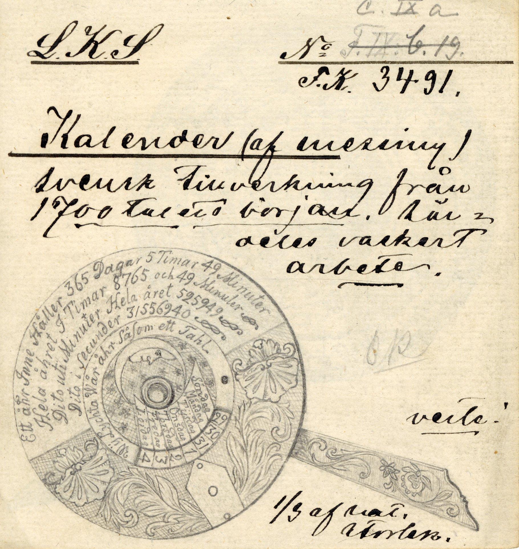 - Cirkelrund mässingsskiva med 110 mm:s diameter. På skivans framsida inom cirklar ingraverat från kanten mot centrum månadernas dagar, den 10:nde, 20:nde, 30:nde och 31:ste angivna med siffror. Månadernas namn. Djurkretsens symbolfigurer. På baksidan ytterst ett band med bladornament samt ett textfält med texten: Ett åhr Inne Håller 365 Dagar 5 timar 49 minuter. Hela åhret I Timar 8765 och 49 minuter. Dito uti Minuter Hela åhret 525949. Dito i secunder 31556940. Där innanför ett textband med 1/4 genombrutet, med texten: Wij Lychta Wår åhr Såsom ett Tahl. I centrum ett fält med månskäran, stjärnor och inom ett textfält veckodagarnas namn. Detta textfält mitt för och intill det genombrutna bandsegmentet. På framsidan av skivan rörligt fästad en tandad cirkelskiva och geometrisk ornamentering. På en av tänderna en solskiva omgiven av strålar som visare. Dessutom är även rörligt flätad på denna sida en ornamenterad visare. I det genombrutna fältet på baksidan är siffror inristade i ett cirkelband. Skivan med månskära och veckodagar samt textraden rörlig.