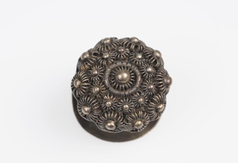 Små, koncentriskt ordnade silverkulor omgivna av filigran.