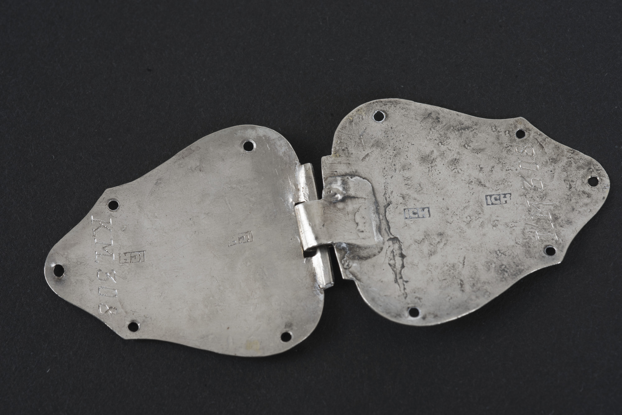 Bladformiga med dekor av ett flikigt blad, förgyllt, omgivet av svisselerad dekor.