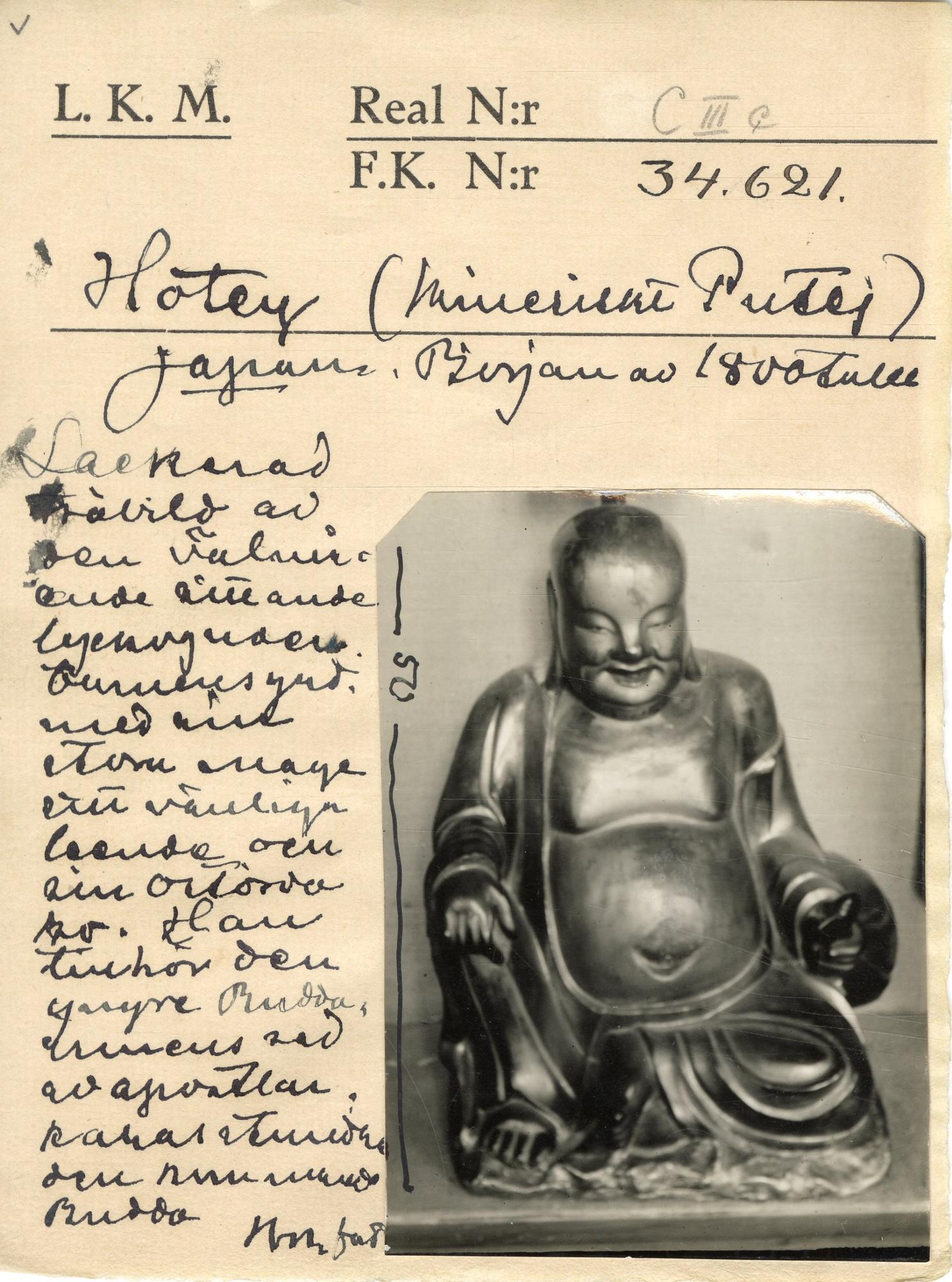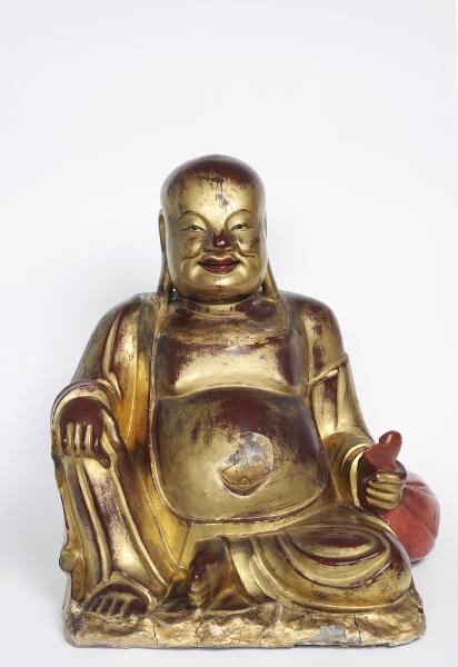 Sittande leende mansfigur, Budai, med bar, stor mage. Han är rakad på huvudet. Lutar vänster arm på en kudde. Lackerad i rött och guld. Lacken har släppt och skulpturen har flertalet sprickor.