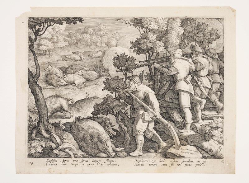 Efter att eld givits fäller (underförstått, predikat saknas, om ej opprimere skall föras hit) man samtidigt vildsvinen i ett försök, när de håriga kropparna rullar runt på den lortiga marken, kväser man dem: och det är en konst att med hårda ekollon/kastanjer döda: när situationen är farofylld jagas det med spjut.