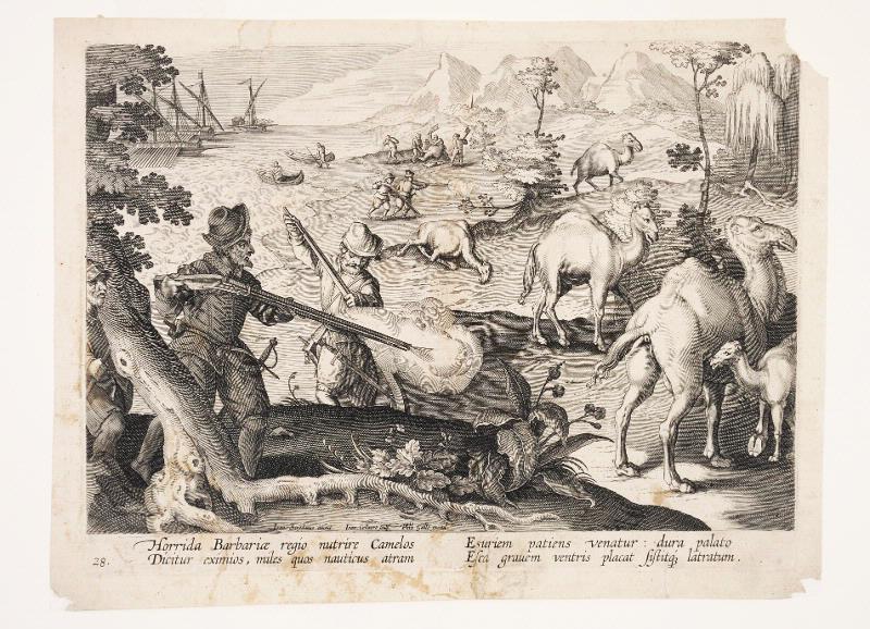 landskap; berg; hav; skepp; båt; roddbåt; jakt; person; jägare; man; gevär; hatt; träd; växt; kamel; slakt; yxa; svärd; blomma; kruthorn