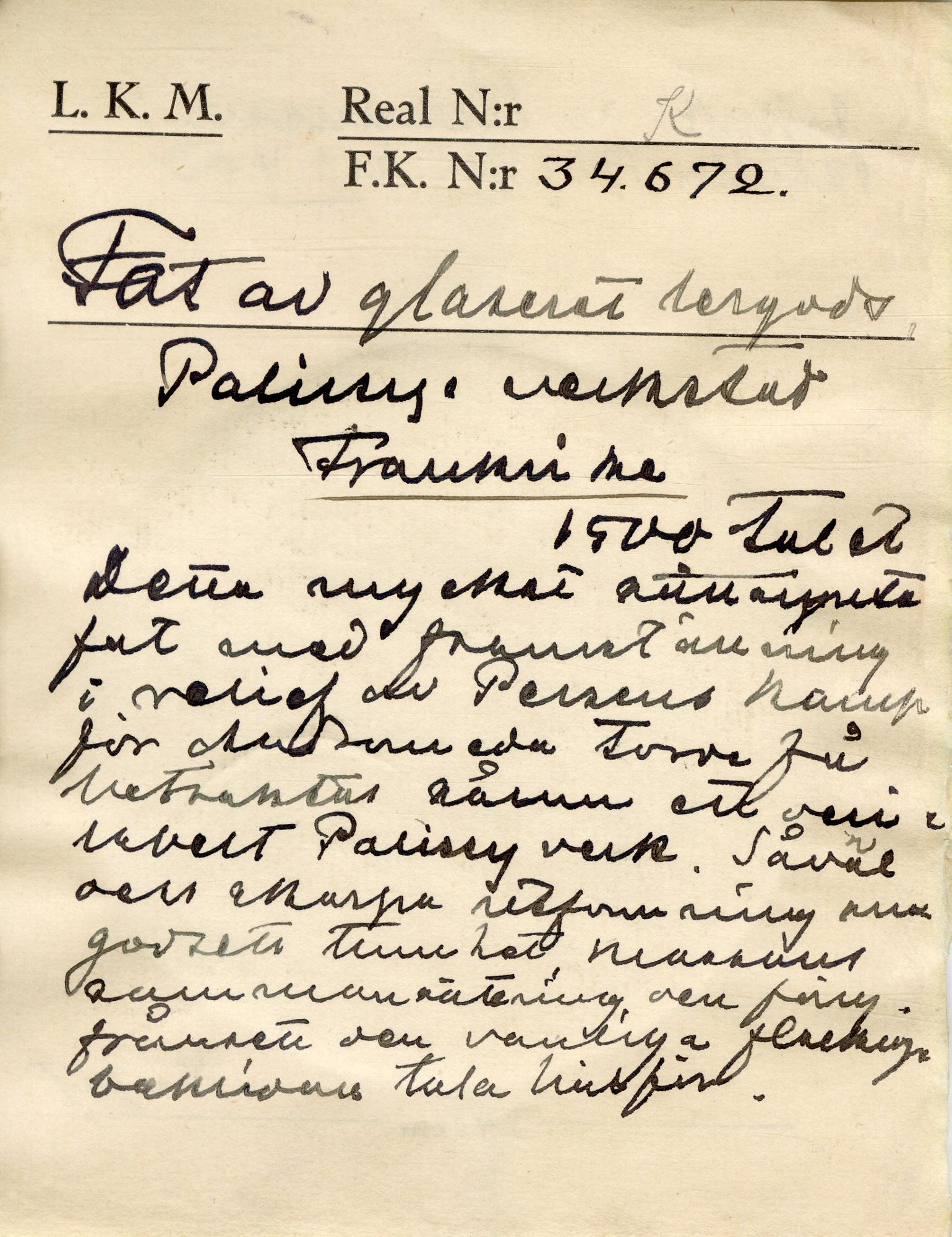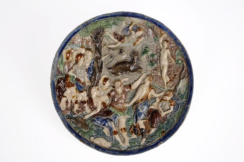 "Fat av glaserat lergods med motiv ur sagan om PERSEUR och ANDROMEDA. Bernard Palissy, Frankrike, 1570-talet."