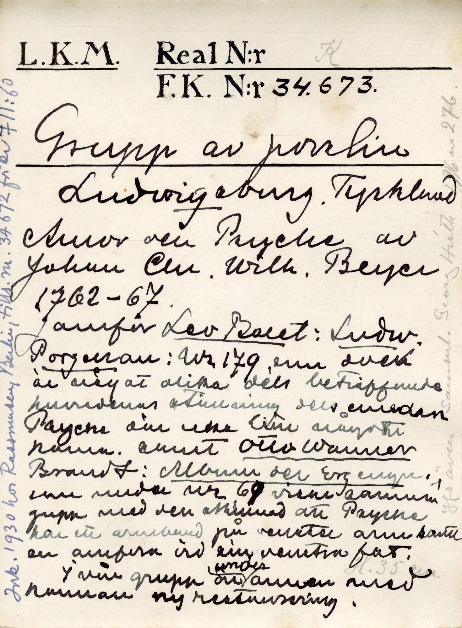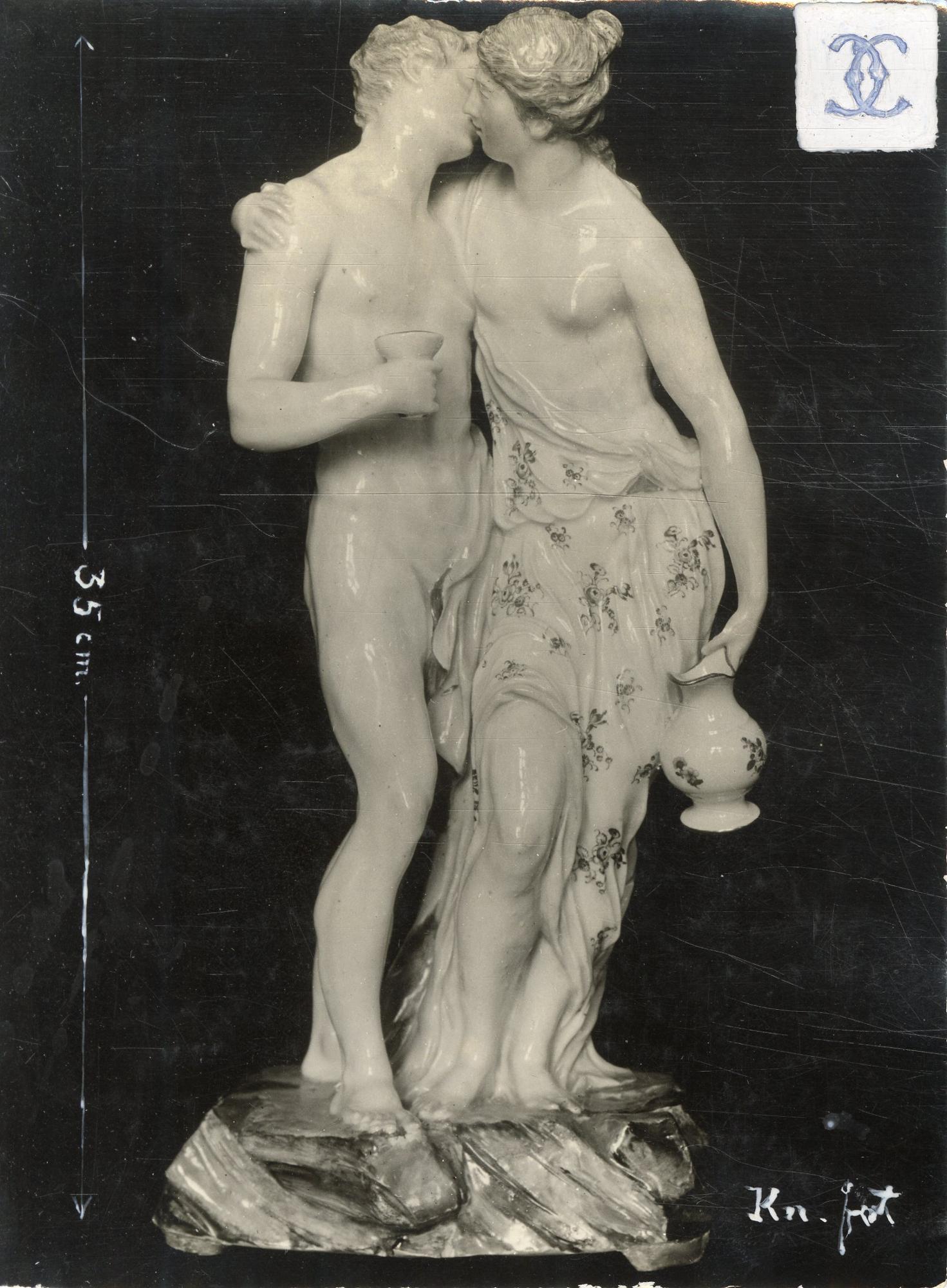 - Amor och Psyche. Man och kvinna som håller om varandra. Han naken, hon i en blommig klänning, nedhasad över ena axeln så att överkroppen blottas. I sin fria hand håller hon en kanna [underarmen med kannan är en rekonstruktion], han håller en bägare. Polykrom, ljus färgskala. Sockel i form av flat stenhäll.