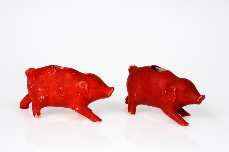 I form av springande gris med hål för julgransljus i ryggen. Vitt porslin, kallmålade i rött med tryckt i svart text på ena sidan: "God Jul" i svart.