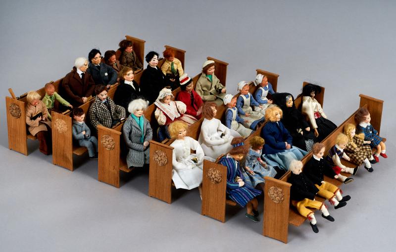 Lösa dockor: 1 spädbarn i doppåse med tillhörande mor eller gudmor i folkdräkt, 6 större barn, 10 män, 8 kvinnor, 3 sjuksköterskor, 2 kvinnliga konfirmander, 1 präst, 1 diakonissa med kollekthåv.