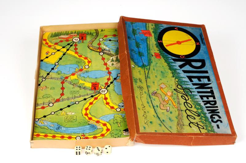 - Tärningsspel med spelplan med fyrfärgstryck föreställande landskap med orienteringskontroller. Spelarna kan välja väg till varje kontroll antingen en längre röd bana eller en svart dito med genvägar som dock är svårare då varje kontroll då måste nås via jämt slag med tärningen. Spelarna måste välja svart eler röd väg innan tärningen slås, både före start och efter varje ny kontroll. Kartong med påklistrat fyrfärgstryck på locket, text: Orienteringsspelet med o:et utformat som en kompass. På lockets insida spelregler. Asken innehåller förutom spelplanen 4 tärningar. Spelpjäser saknas. Kartongens undersida lagad med maskeringstejp.