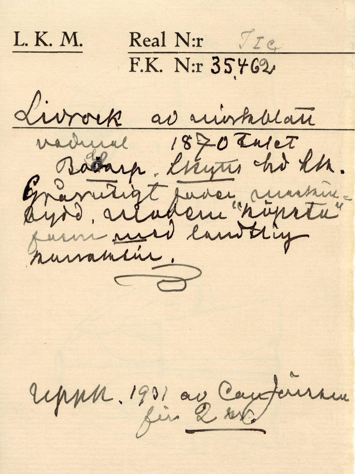 Livrock av mörkblått vadmal 1870-talet Bodarp, Skytts hd [oläsligt]. Grårutigt foder maskinsydd, modern "köpetu" [oläsligt] med lantlig karaktär. Uppk. 1931 av Carl Jönsson för 2 kr. [fram - och baksida avbildad på katalogkortet i skala 1:20]