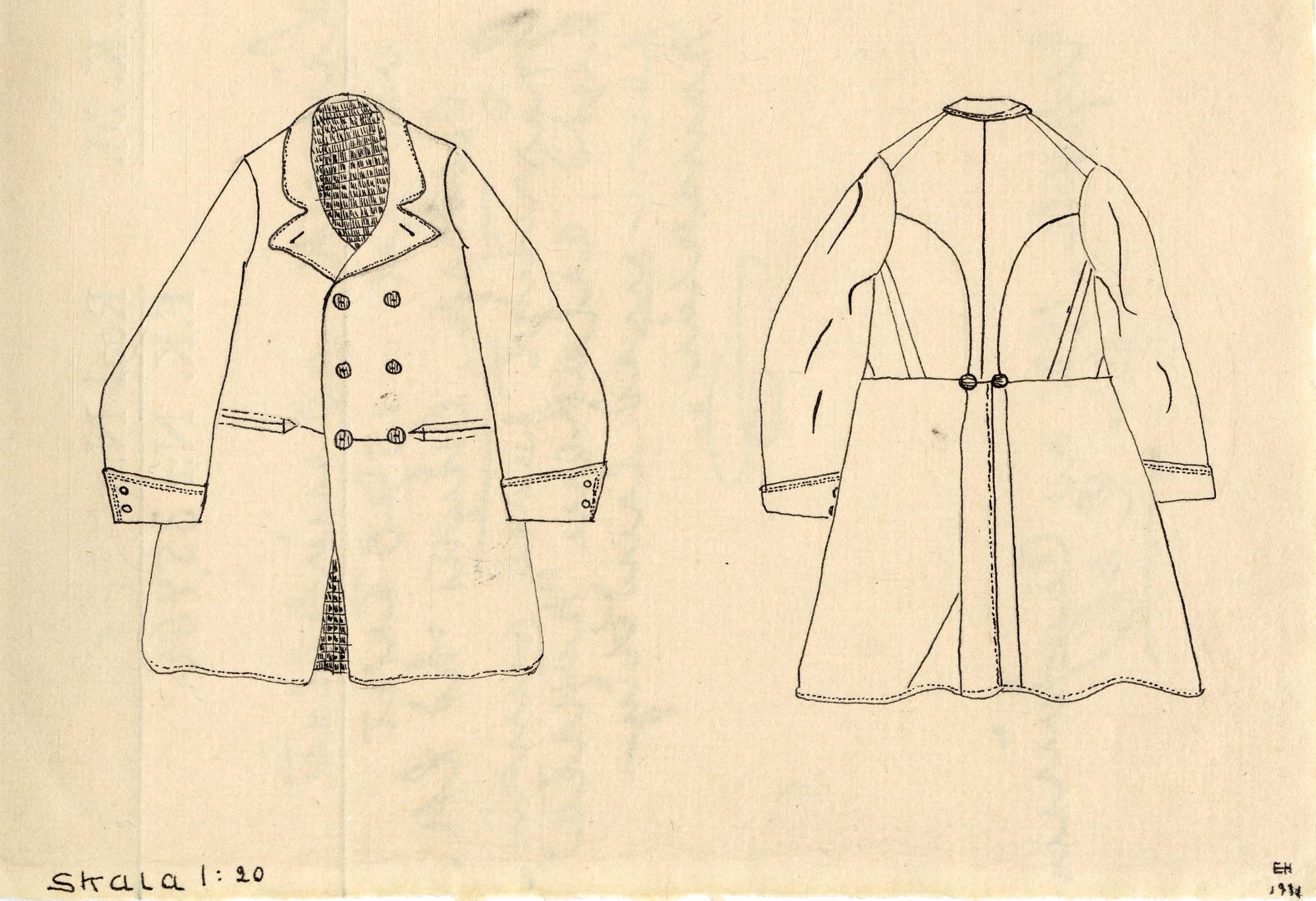 Mörkblå vadmal, avskuren i midjan, sprund i ryggen. Dubbelknäppt med 8 knapphål och 7 svarta, randiga knappar. 2 knappar i ryggen. Linnefoder i mörkbrunt och naturfärgat garn. Fodret i ärmarna och fickorna av randigt linne i violett, brunt, gråvitt och grått, vit varp. 2 knappar på vardera manschett. [avritad i skala 1:10 på katalogkort] Kraftigt malangripen, december 1994.