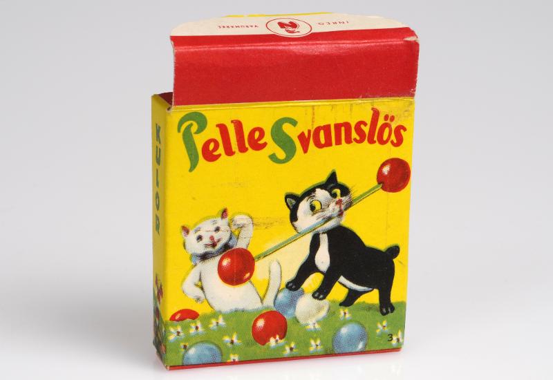 tablettask Pelle Svanslös, Nissens Norrköping. Pelle och Maja Gräddnos. Pelle med skivstång i munnen.