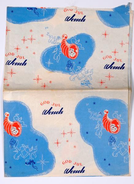 vitt med text och motiv i blått och rött, änglar, ymnighetshorn, julklappar; Wessels, skriven text: Titti önskas God Jul.